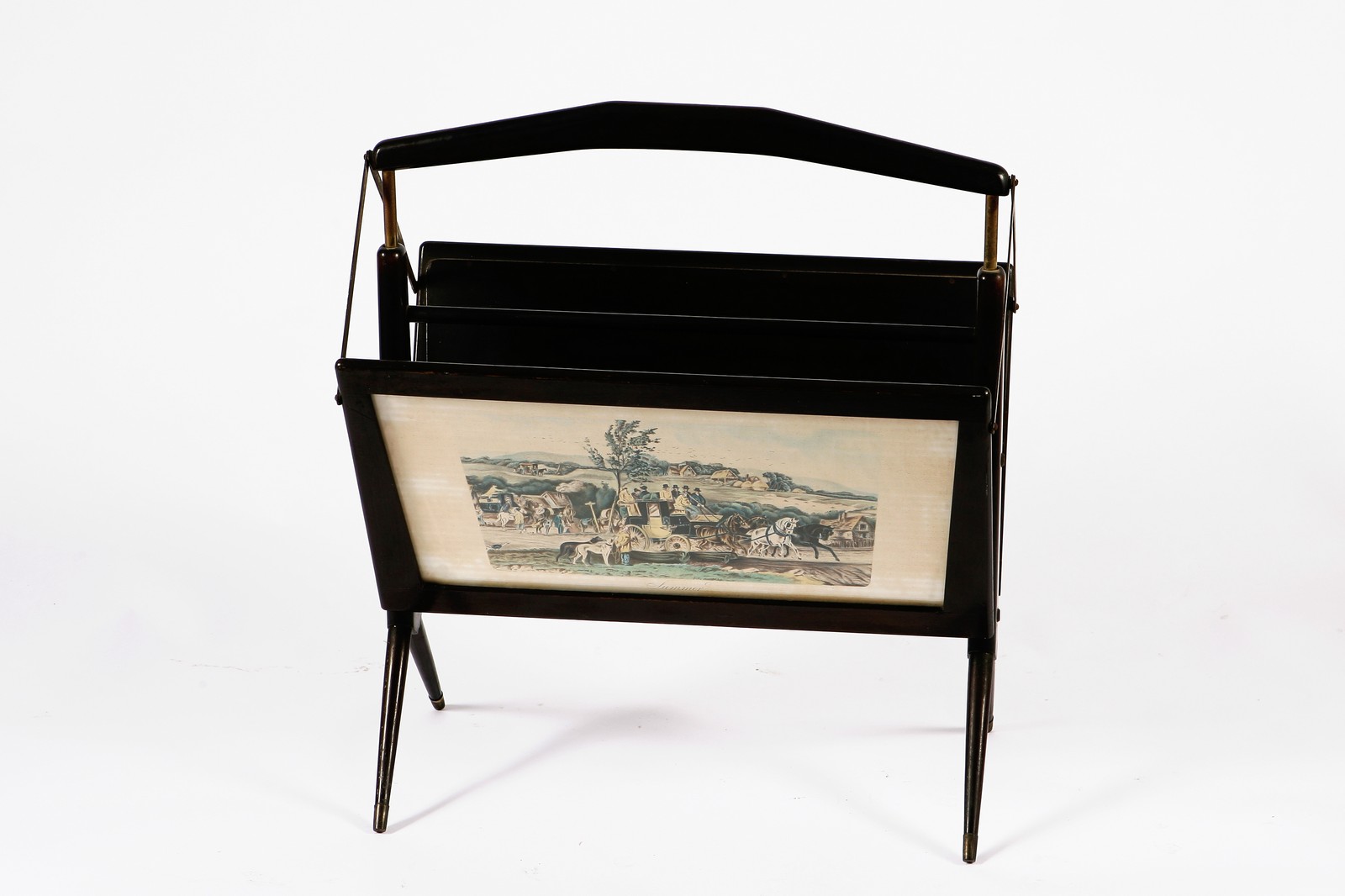 PRODUZIONE ITALIANA - ITALIAN WORK. Portariviste pieghevole anni 60 , decorato con stampe inglesi. Folding magazine rack of the 60 ', decorated with English prints. Cm 50x52x31.