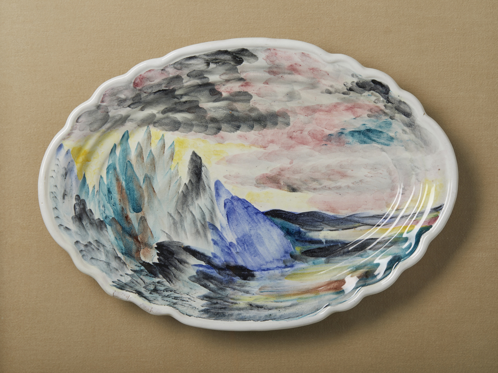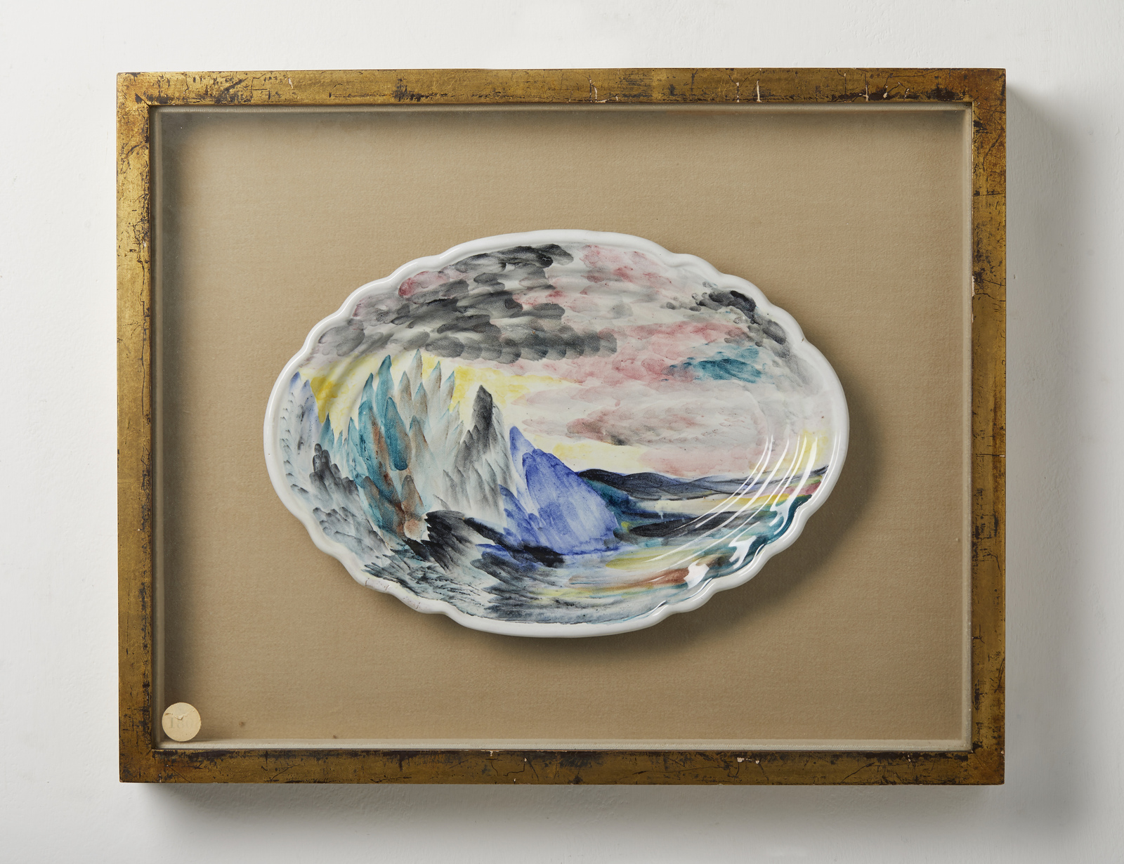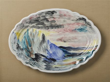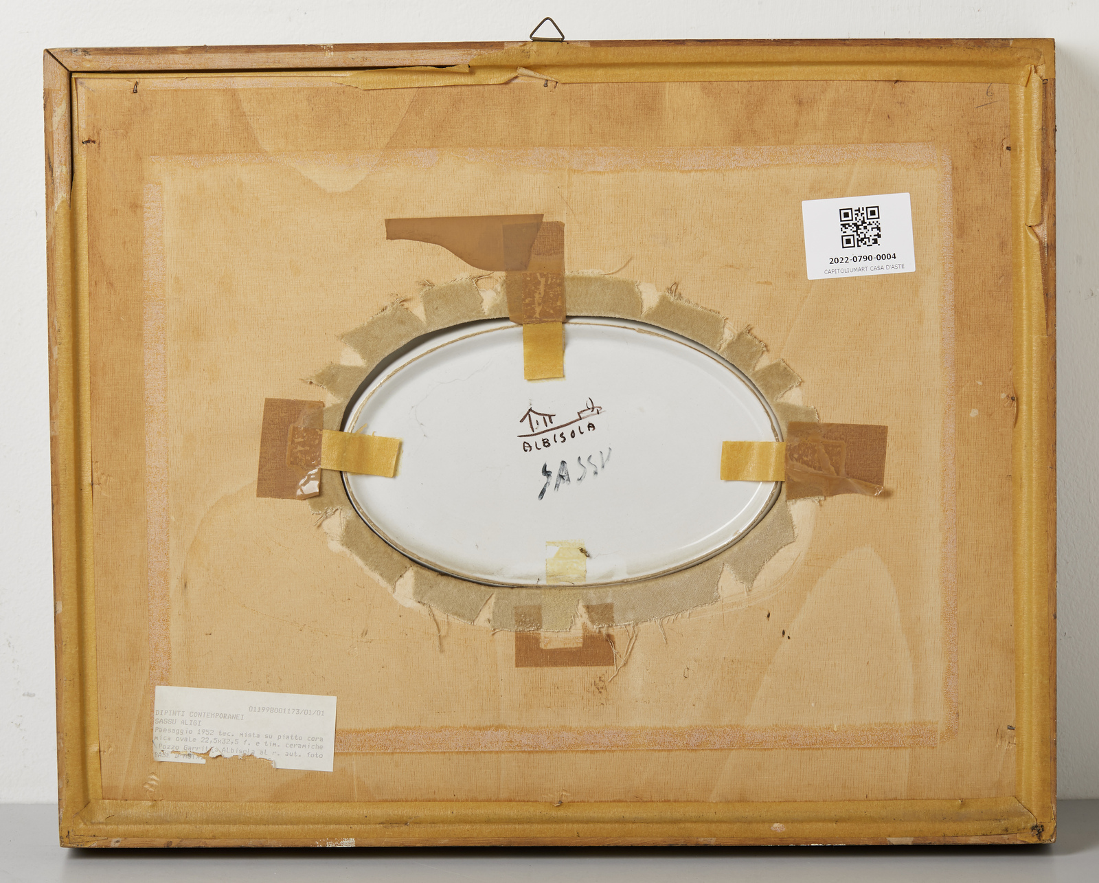 SASSU ALIGI (1912 - 2000) Paesaggio. 1952. Piatto in ceramica. Cm 22,50 x 32,50. Pezzo unico. Firma al retro. Pozzo Garitta, Albisola. Autentica dell'artista su fotografia. Cornice presente