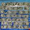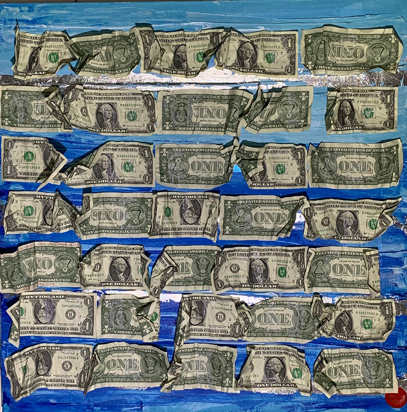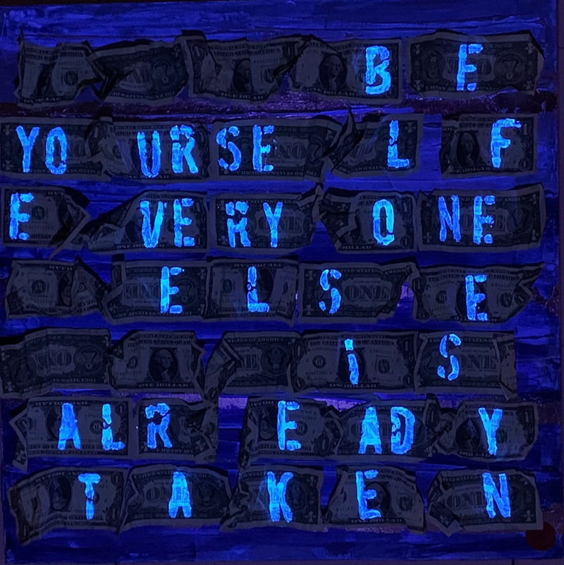 Colore acrilico blu con applicazione di foglie d'argento e banconote americane 1 USD con luce ultravioletta appaiono scritte con colore fotosensibile blu
