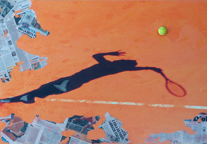 Collage carta di giornale, rete PVC e pallina da tennis