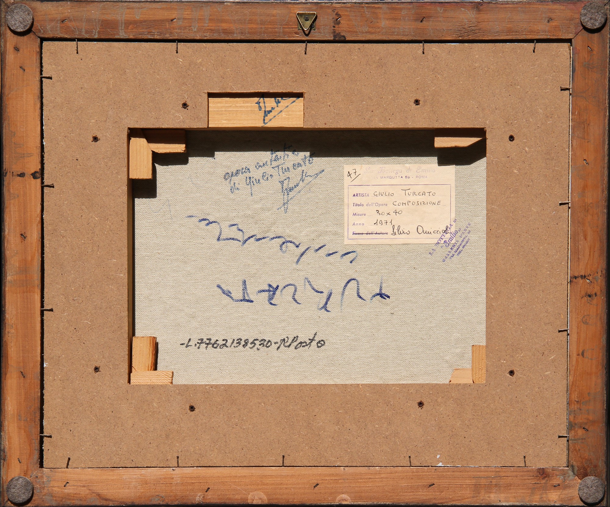 Firma, dichiarazione di autenticità, numerazione "Turcato, opera autentica di Giulio Turcato, -L.7762138530-RPosto";