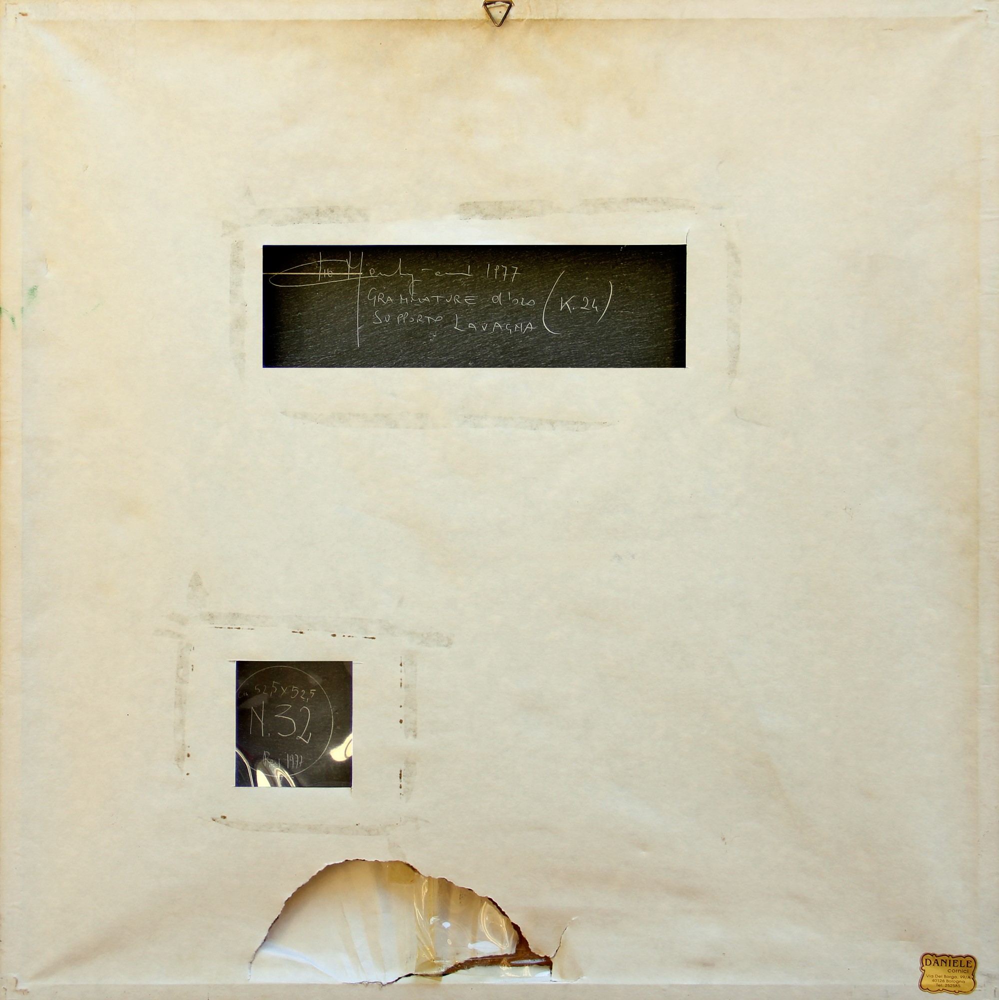 Firma, data, titolo, tecnica, misura, numerazione "Elio Marchegiani, 1977, Grammature d'oro (K.24), supporto lavagna, cm 52,5x52,5, N. 32 Reg. 1977" (al retro)