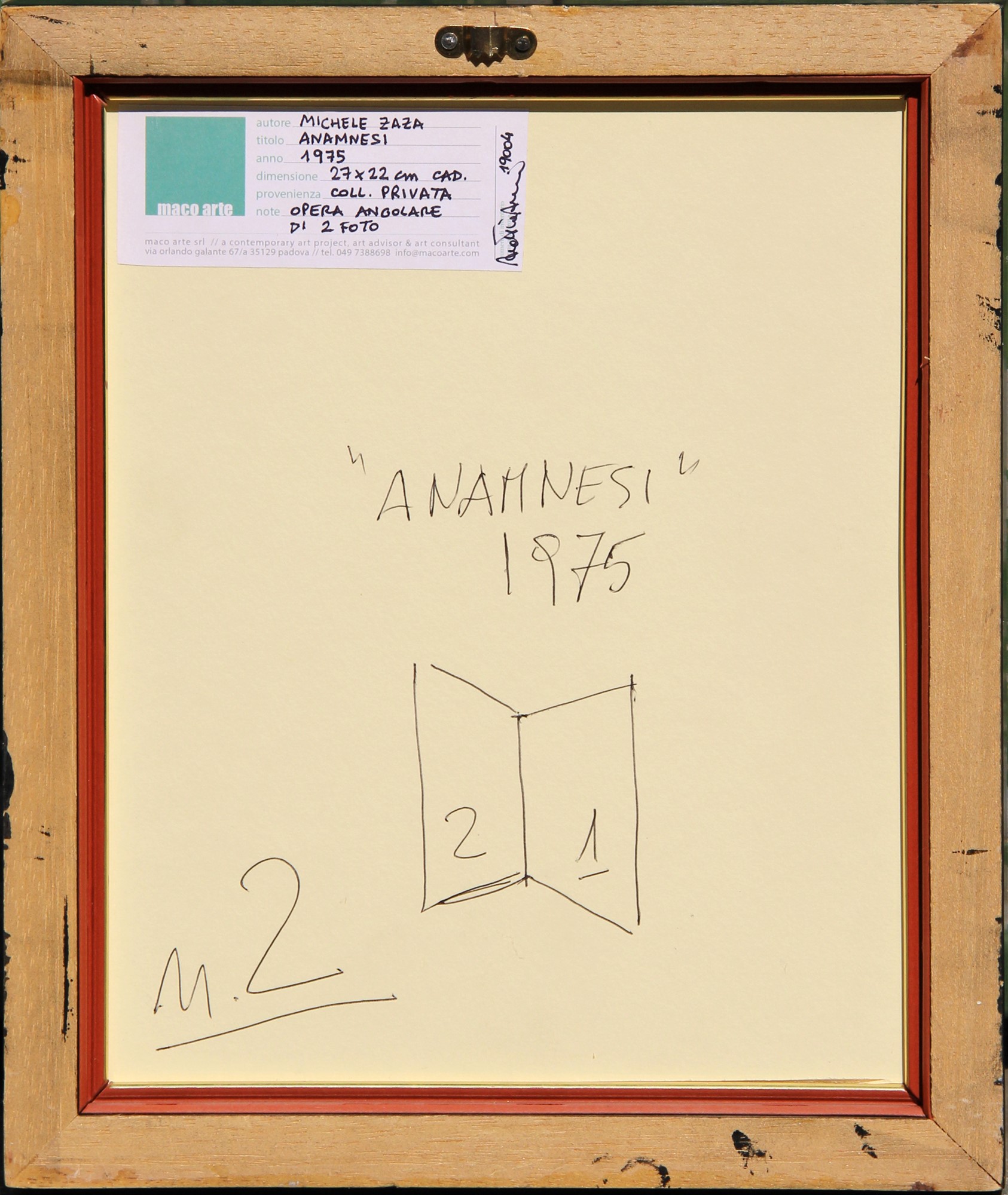 Titolo, data, descrizione, numerazione, firma "Anamnesi, 1975, opera angolare di 2 foto, n.1, Michele Zaza" (al retro)