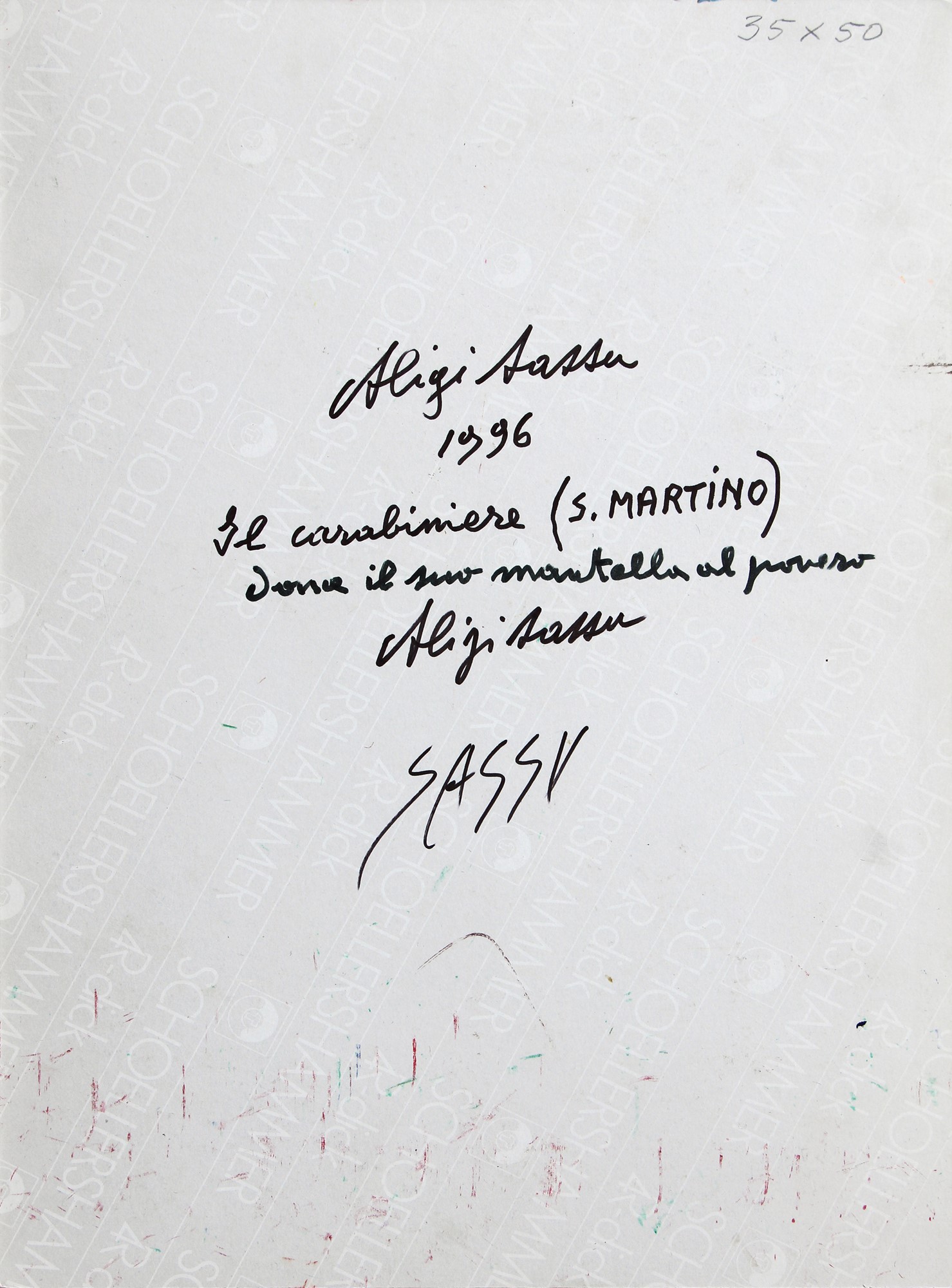Firma, data, titolo, firma "Aligi Sassu, 1996, Il cavaliere (S. Martino) dona il suo mantello al povero, Aligi Sassu" (al retro)