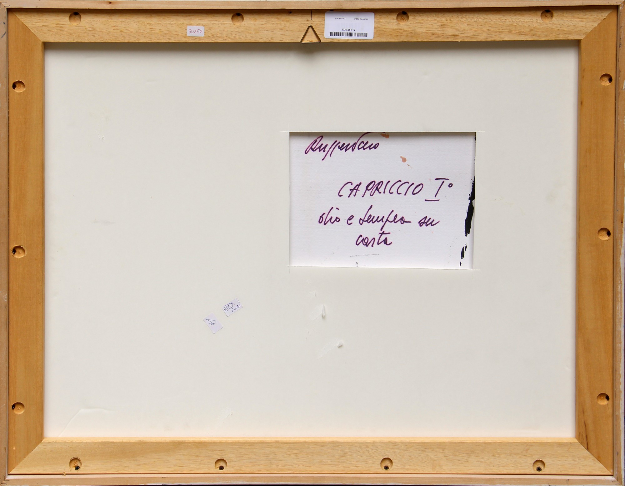 Firma, titolo, tecnica "Ruggeri Piero, Capriccio I, olio e tempera su carta" (al retro)