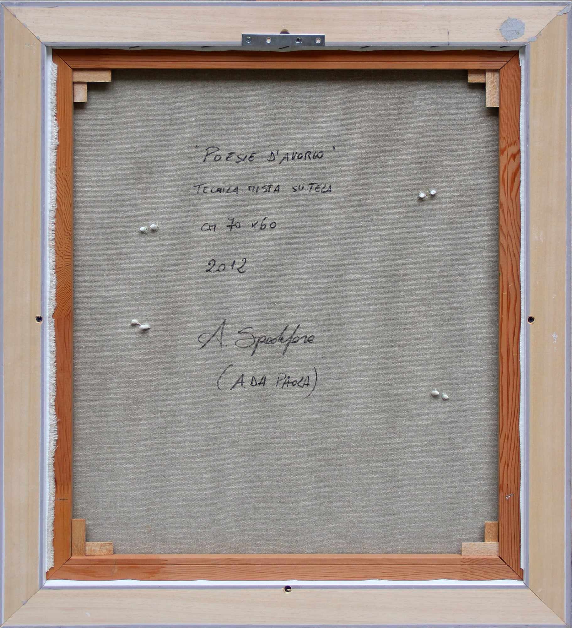 Titolo, tecnica, misura, data, firma "Poesie d'avorio, tecnica mista su tela, cm 70x60, 2012, A. Spadafora (A. da Paola)" (al retro)
