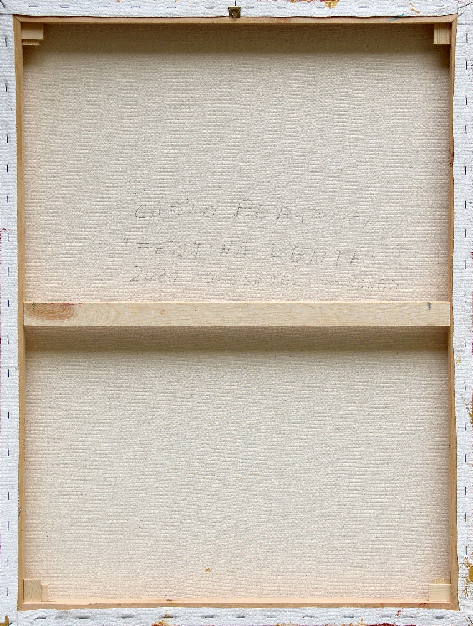 Firma, titolo, data, tecnica, misure "Carlo Bertocci, Festina lente, 2020, olio su tela, cm 80x60" (al retro)