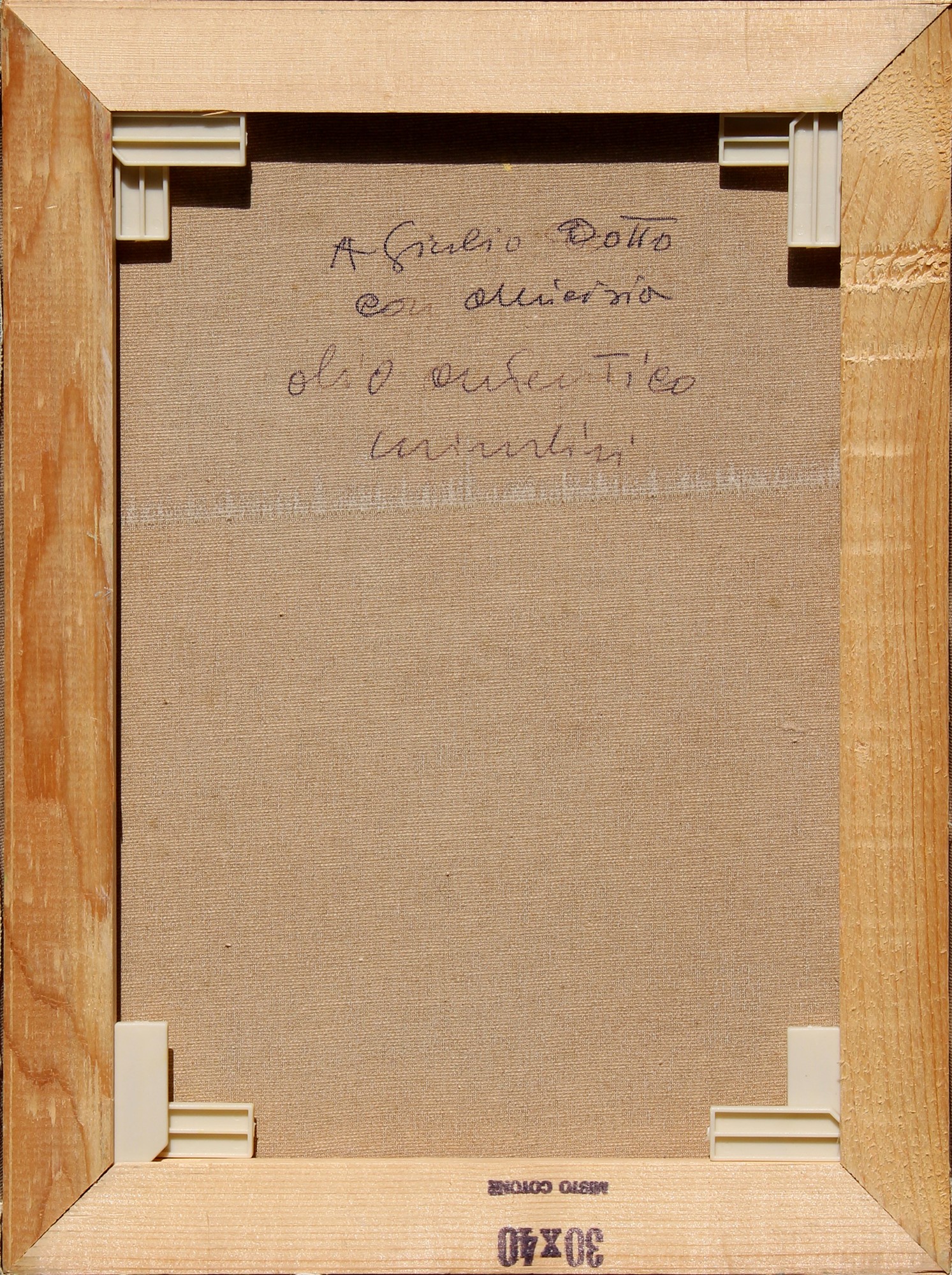 Dedica, dichiarazione di autenticità, firma " A Giulio Dotto con amicizia, olio autentico, Brindisi" (al retro)