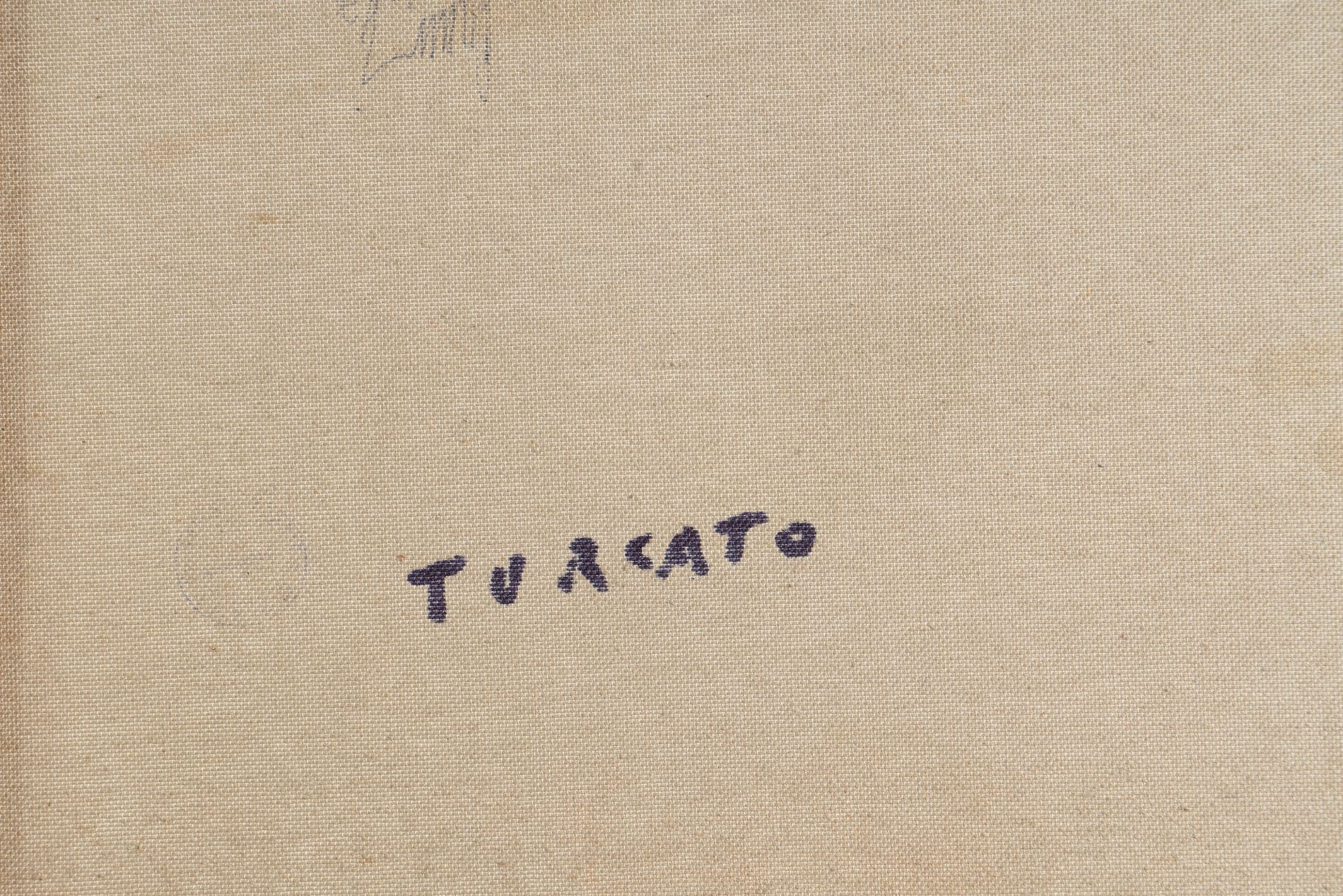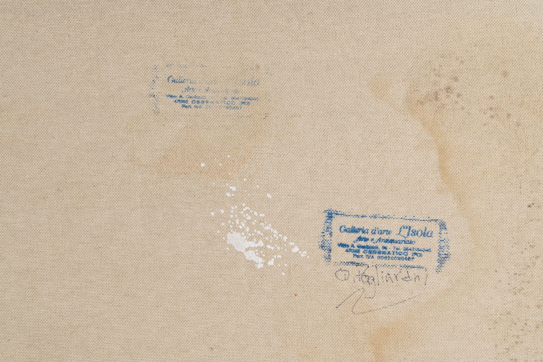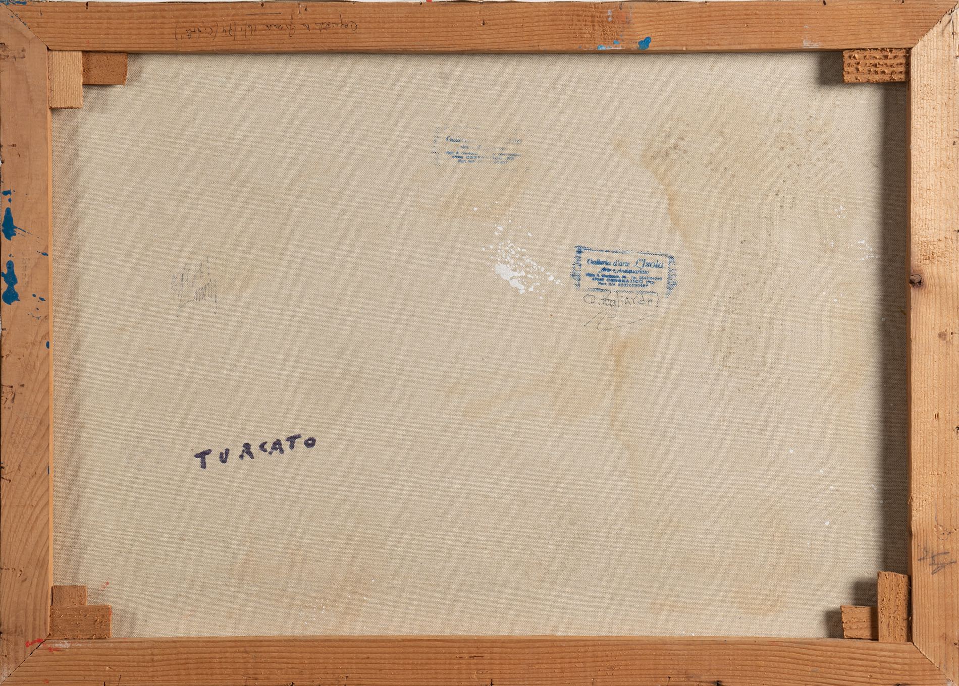 Tecnica mista su tela, firmato in basso a destra, reca al retro firma dell’artista e timbri della Galleria d’Arte L’Isola – Cesena, H cm 50x70