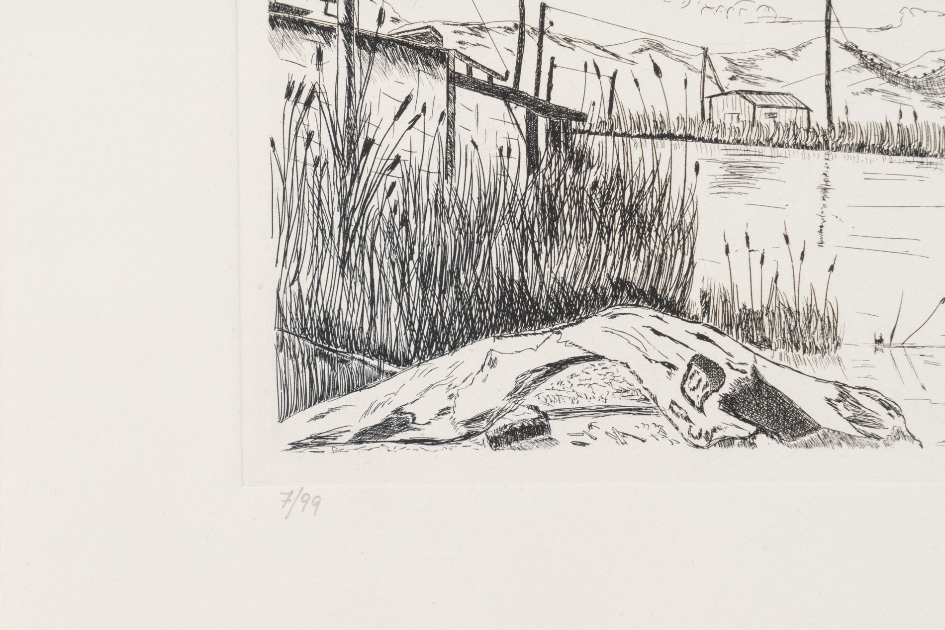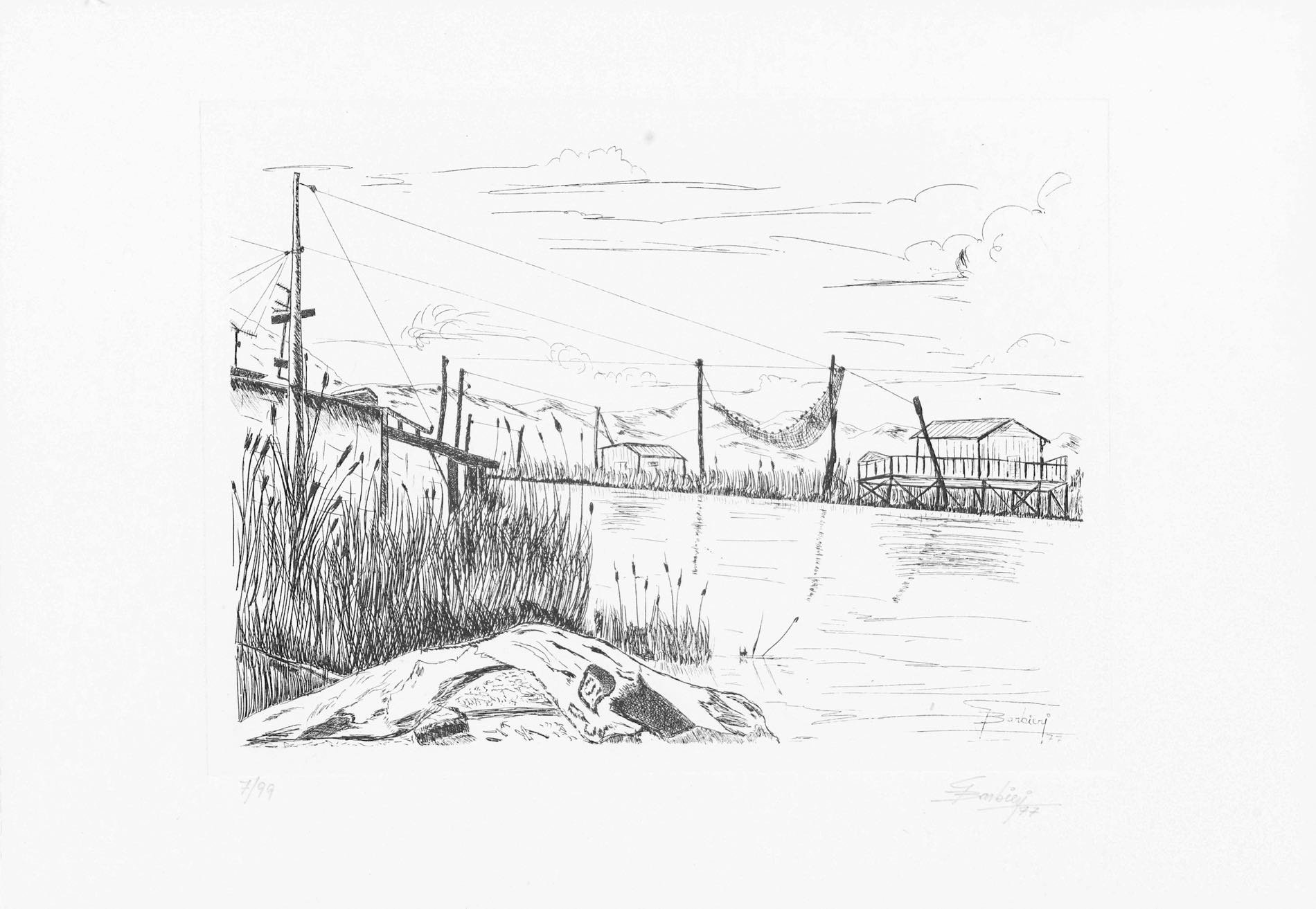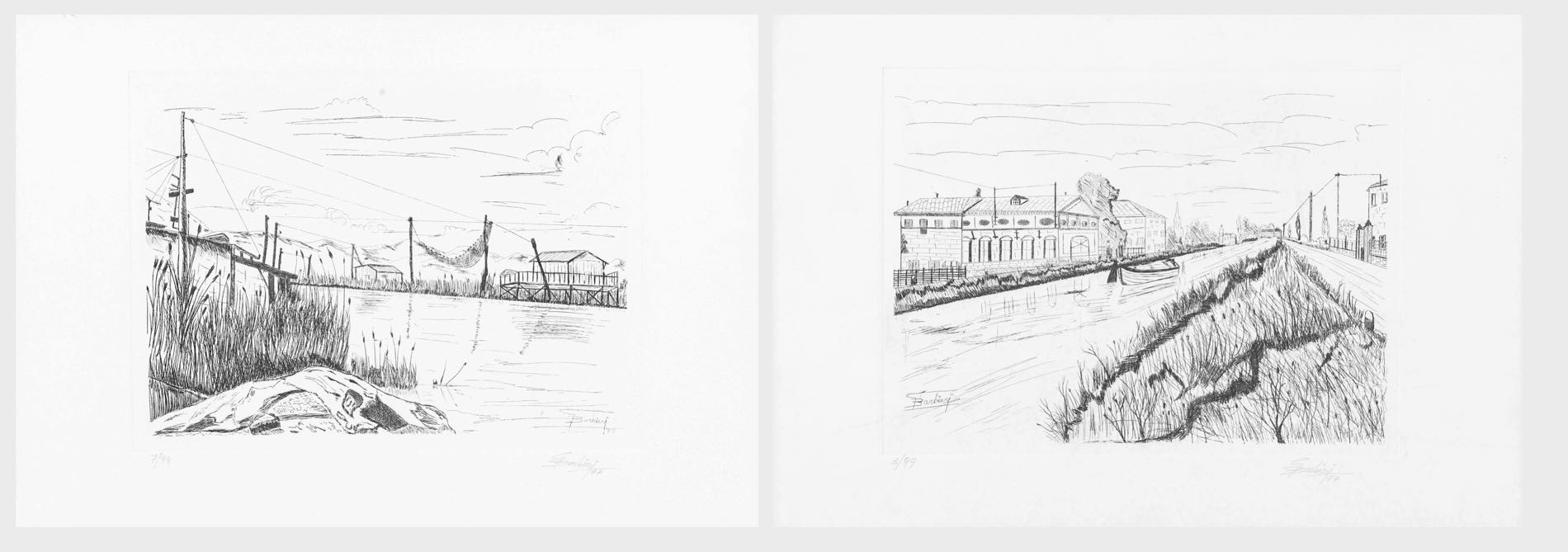 Artista del XX secolo, Coppia di incisioni raffiguranti “Paesaggio fluviale”, 1977.
