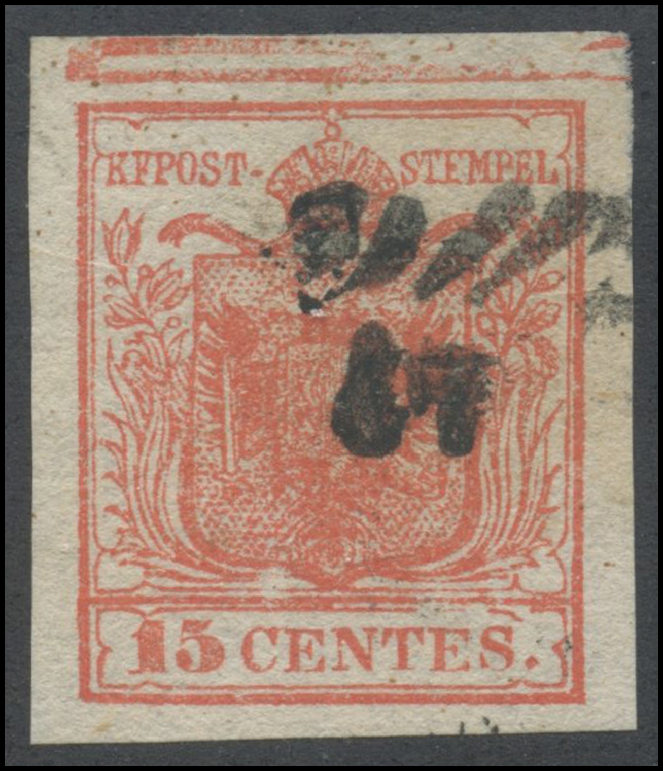 Lombardy - Venetia, 1850, 15c. I° type N.3k with obvious typographic empty space in the upper margin, used. Superb quality (Lux).