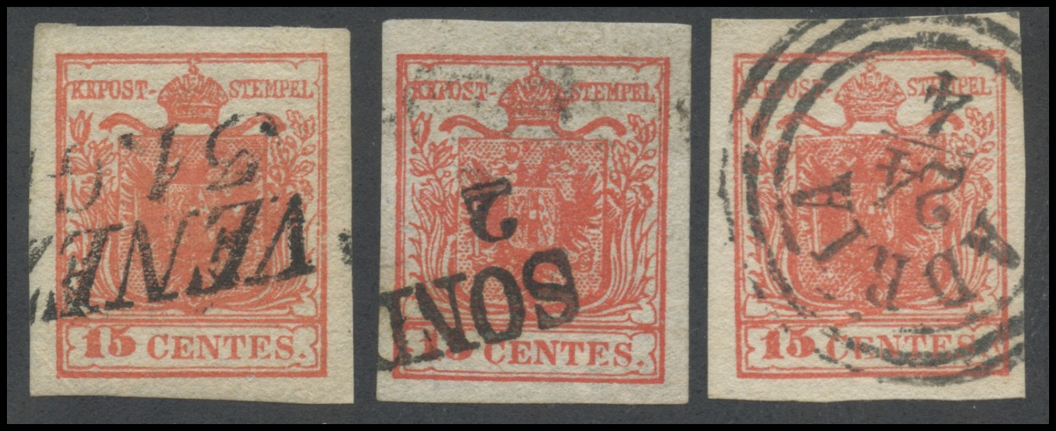 Lombardy - Venetia, 1850, 15c. The N.4 type in three different hues. Two of them signed Raybaudi. (A+) .