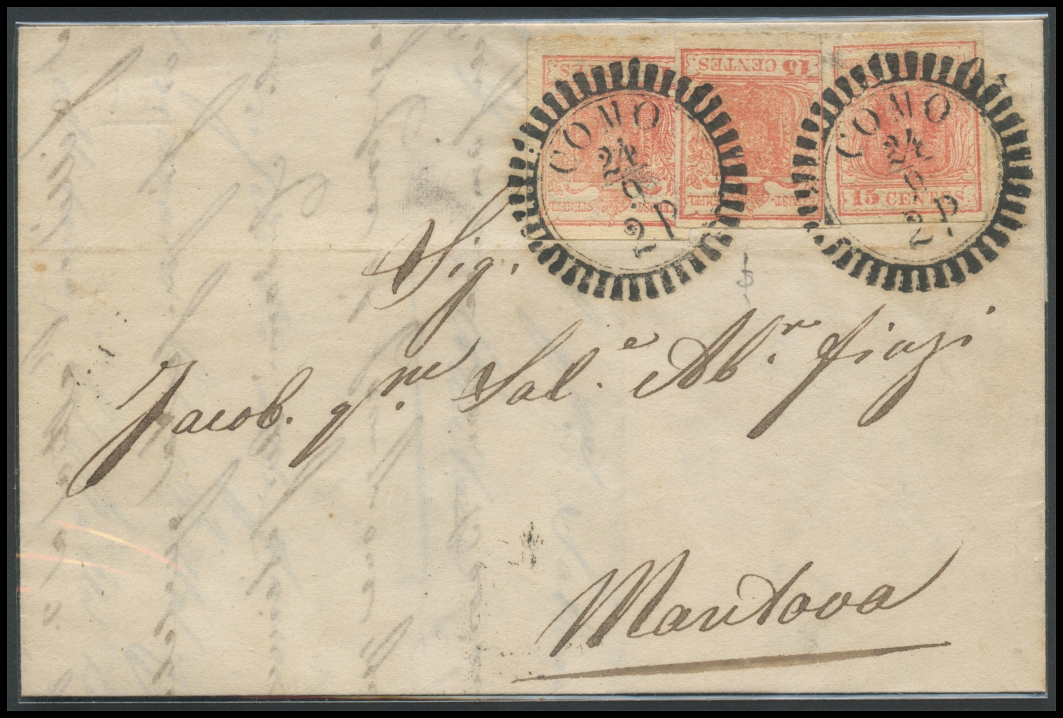 Lombardy - Venetia, 24/6/1851, Letter from Como to Mantova posted for 45c. through three specimens of the 15c. Type II. Noteworthy postage formed by stamps of the same type but of different hues (N.5x2+N.5c). On the postage, seal of the D2P type from Como (7pt). Good quality.