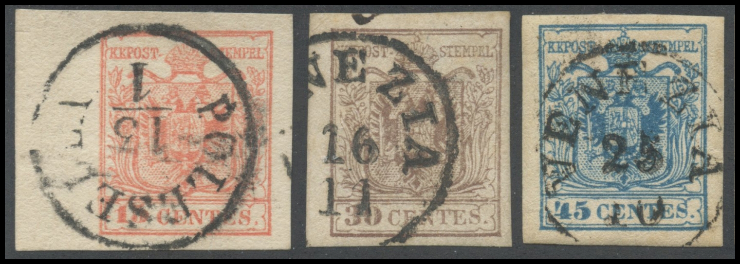 Lombardy - Venetia, 1850, lot composed of 15c., 30c and 45c. Some pairs, stripes and margins have been observed. High-quality. U.