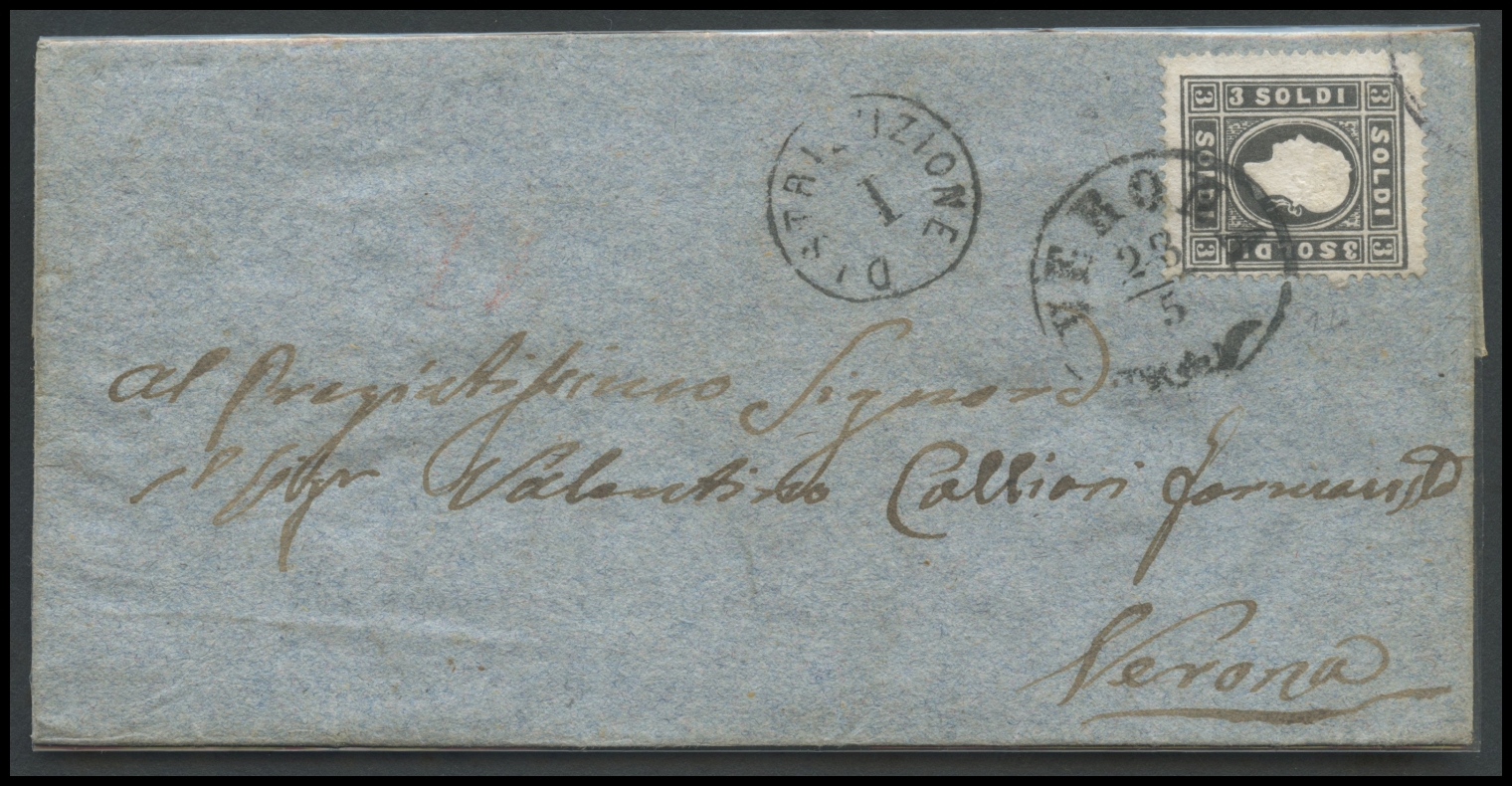 Lombardy - Venetia, 1858, 3s. N.24a Black and gray, used. Caution: the stamp has been properly applied on a letter but it has been determined as a ruse. The stamp is therefore sold separately.