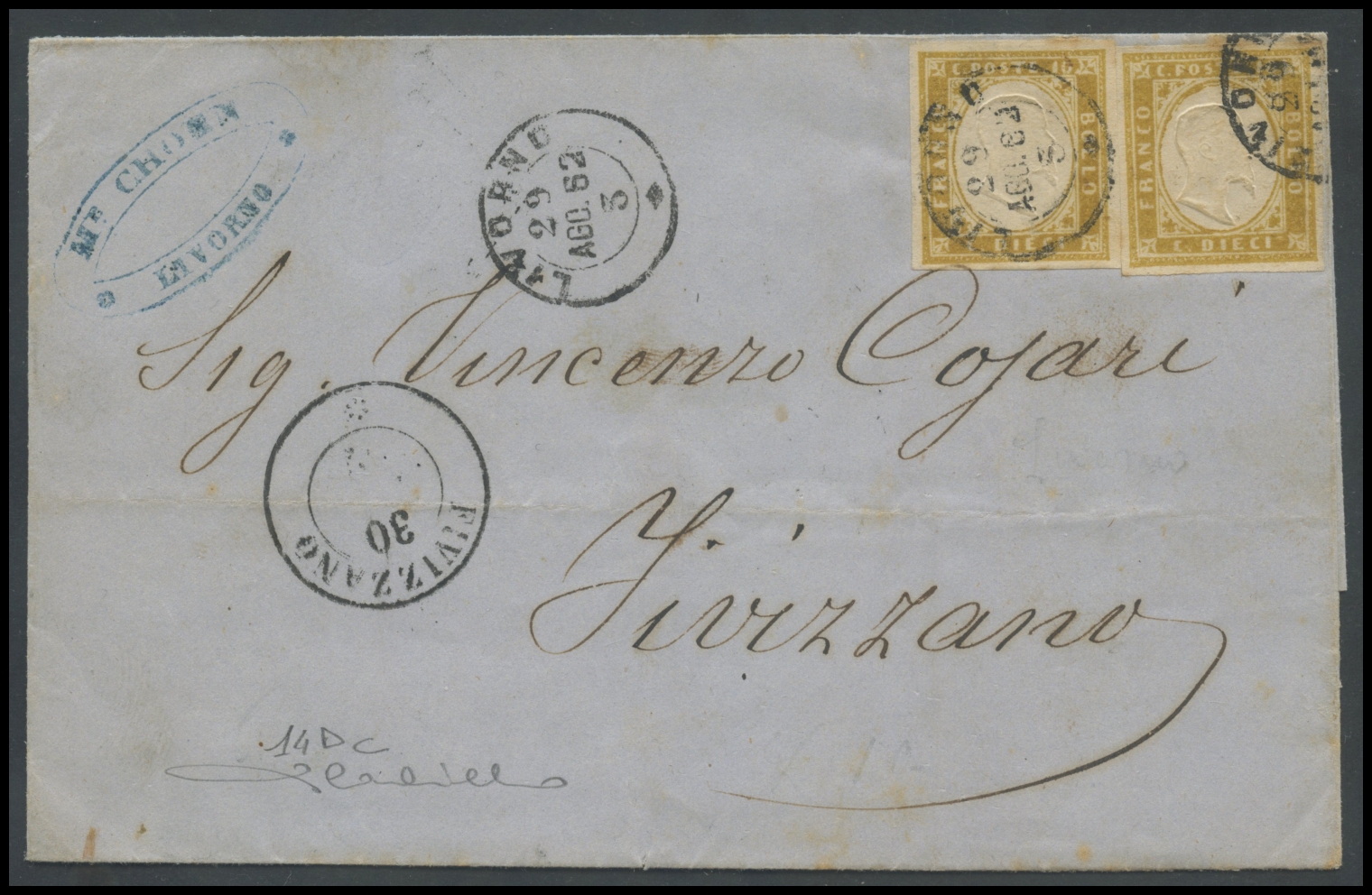 Sardinia, 29.08.1862, Letter sent from Livorno to Fivizzano posted with 20c. by two 10c valuables. Olive Yellow N.14Dc. (A+) (Cert. Cardillo)