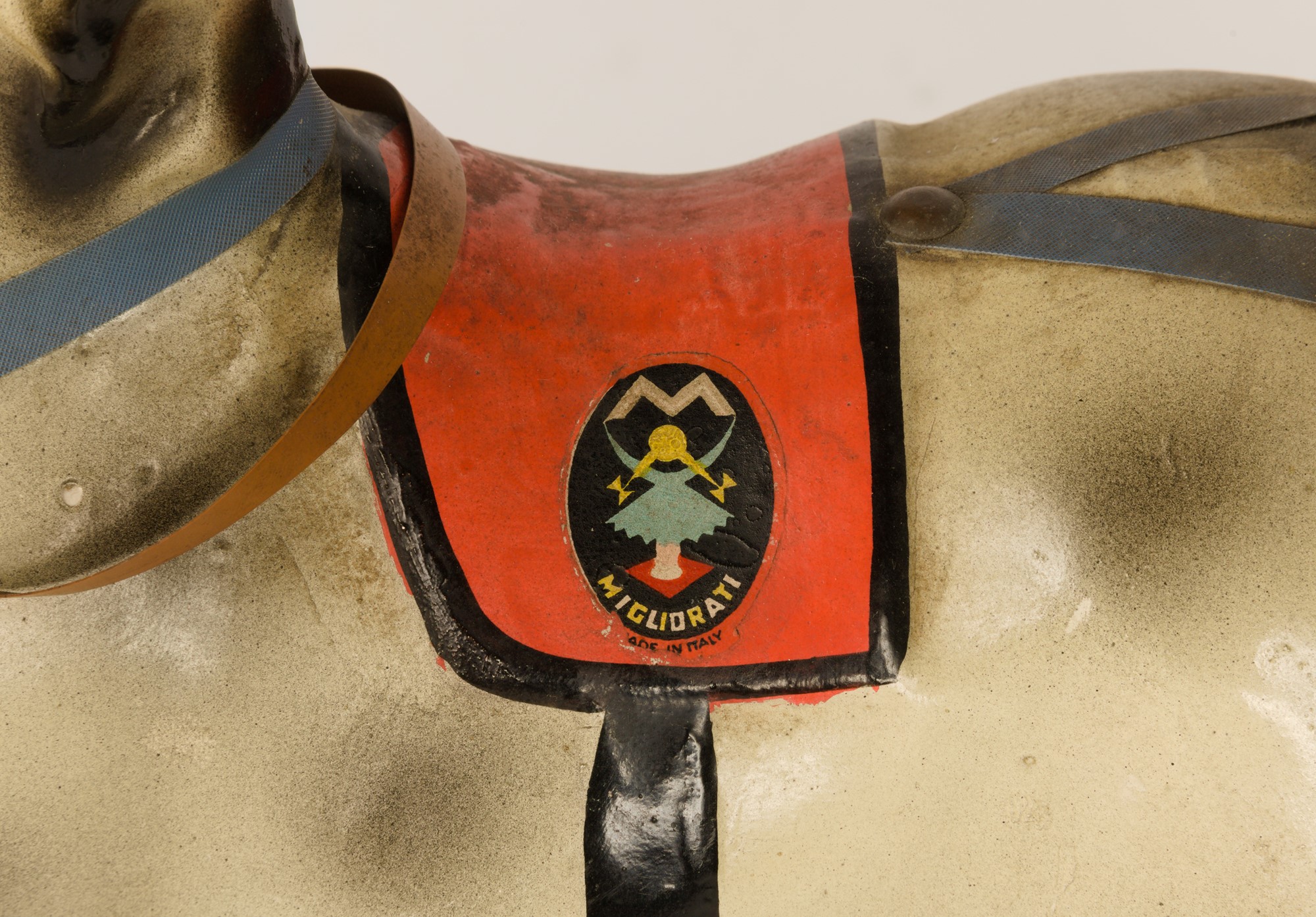 caratterizzato da manto bianco maculato nero, briglie dipinte di azzurro, sella rossa caratterizzata dal logo del marchio Migliorati. Poggiante su pattini in legno dipinto azzurro con ruote