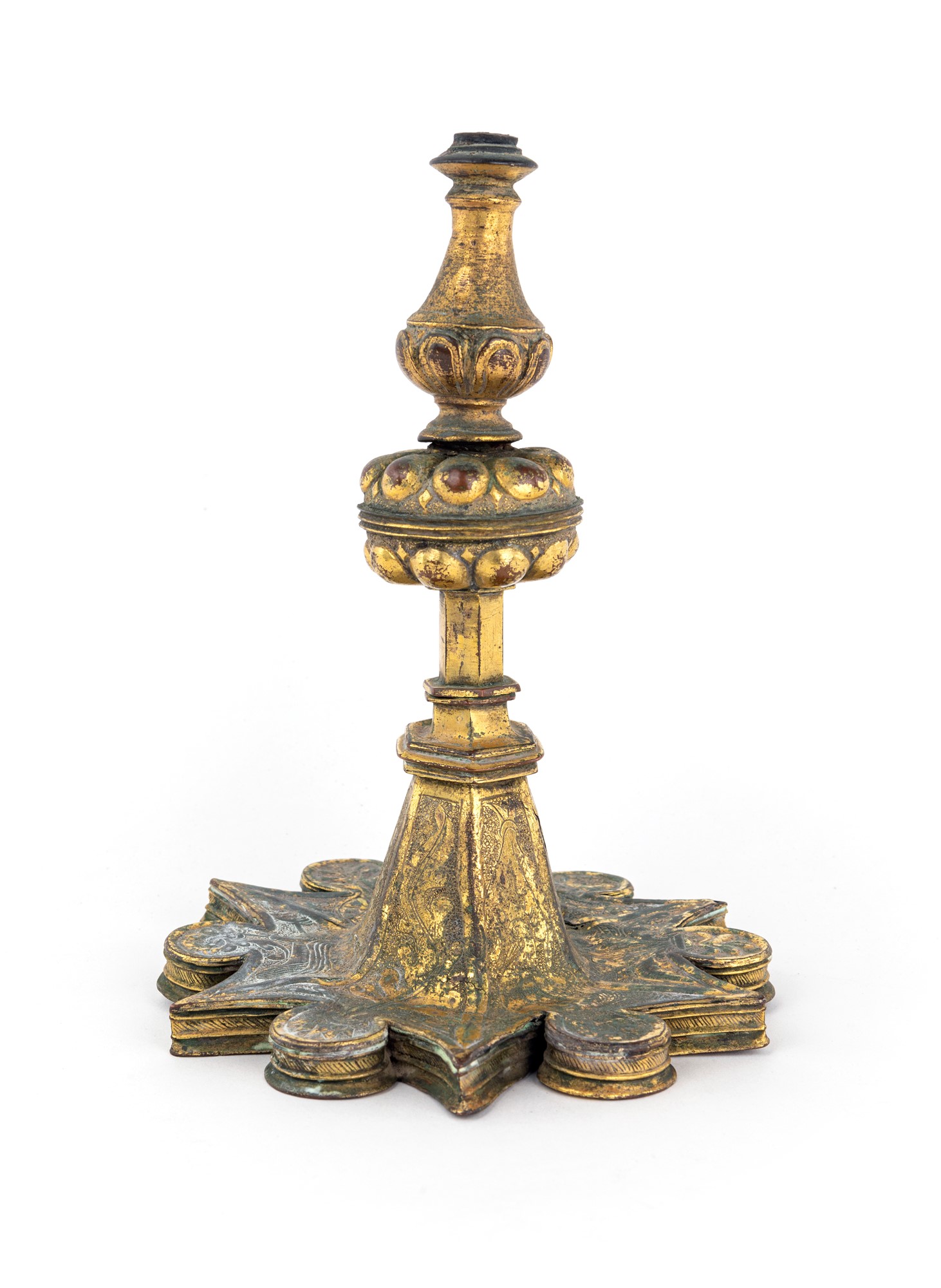 con fitta decorazione incisa e profilo mistilineo a motivi cuspidati alternati a semicerchi; fusto esagonale con sfera baccellata sormontata da un breve balaustro