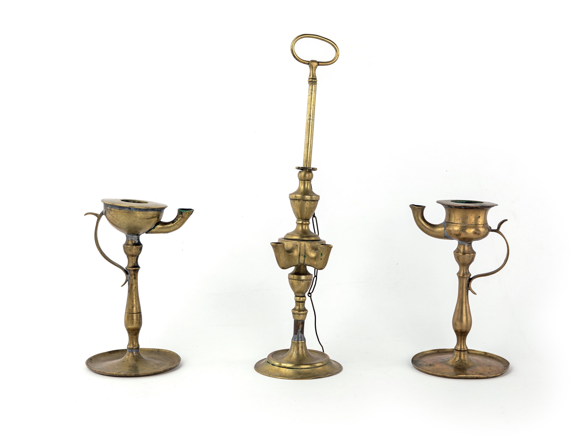 una coppia con serbatoio a vaso ed una "fiorentina" a due beccucci con presa astile centrale