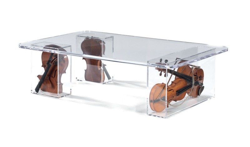 J2L La Chapelle d'Andaine 1936 Tavolo violini (Omaggio ad Arman) Tavolo in plexiglass con violini spezzati, es. unico, cm. 35x125x80 Firma su un violino: J2L.