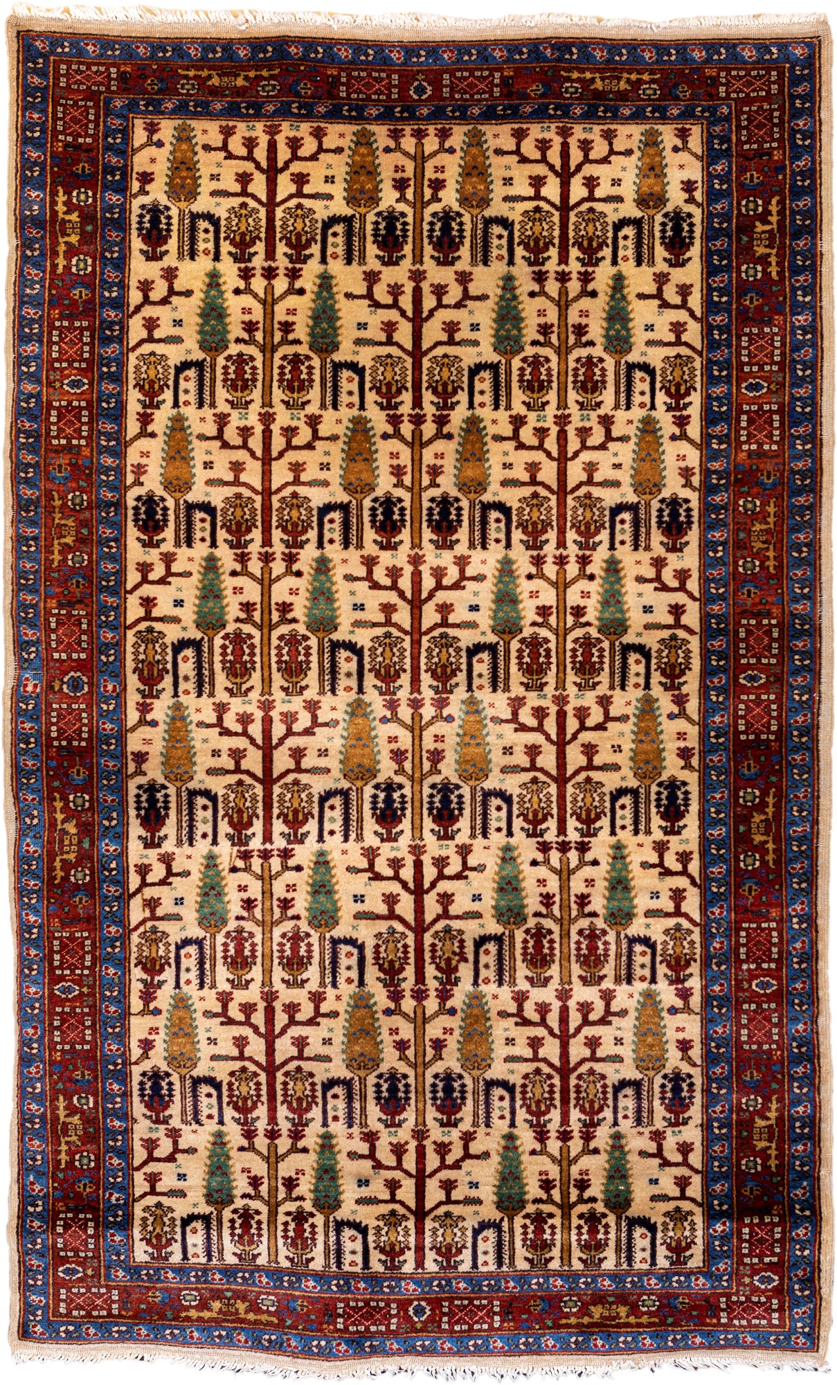 decorato a tutto campo da cipressi alternati ad alberelli stilizzati; cornice principale fondo rosso affiancata da piccole bordure azzurre