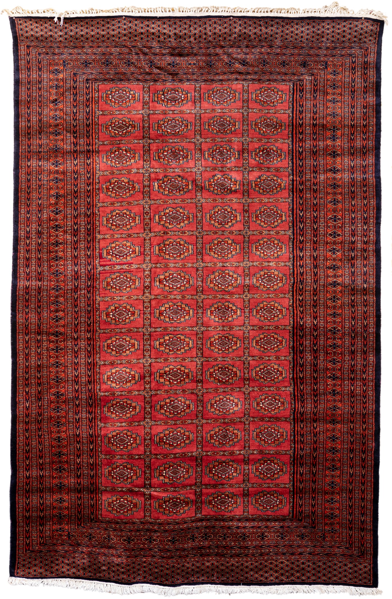 disegno a griglia con quattordici medaglioni disposti su quattro file, racchiuso da molteplici bordure a motivi stilizzati neri e rossi