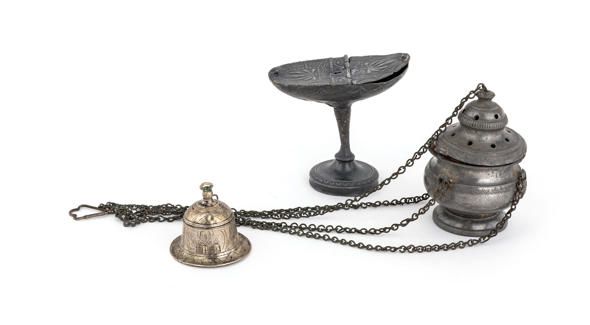 Turibolo e navicella per incenso in peltro ed un campanello in metallo argentato, XIX secolo