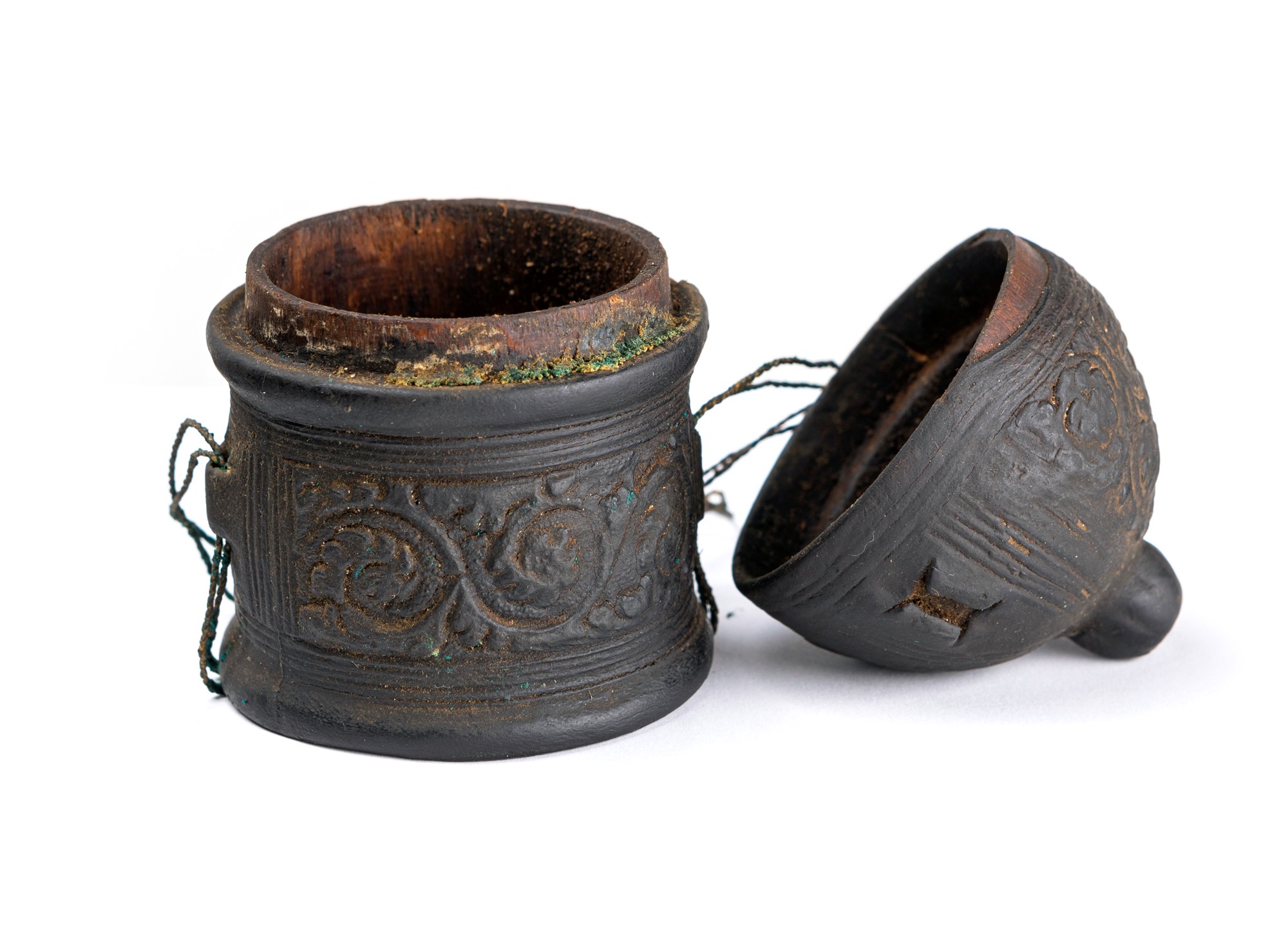 Antico porta unguento da viaggio in legno rivestito in cuoio impresso