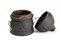 di forma cilindrica con coperchio a cupolino dominato da una piccola sfera; tutta la superficie è caratterizzata da girali in rilievo. Lievi difetti e mancante il contenitore interno