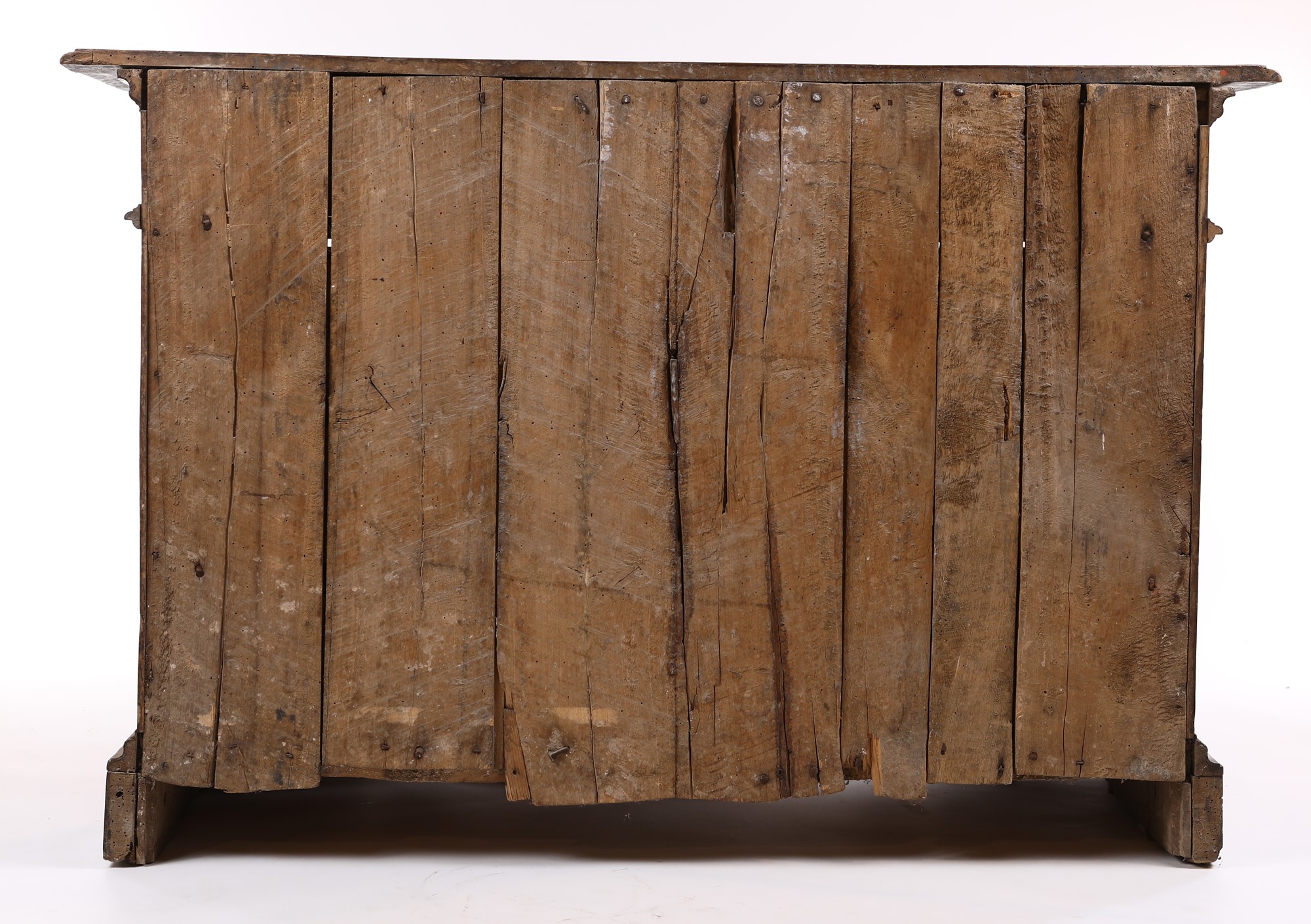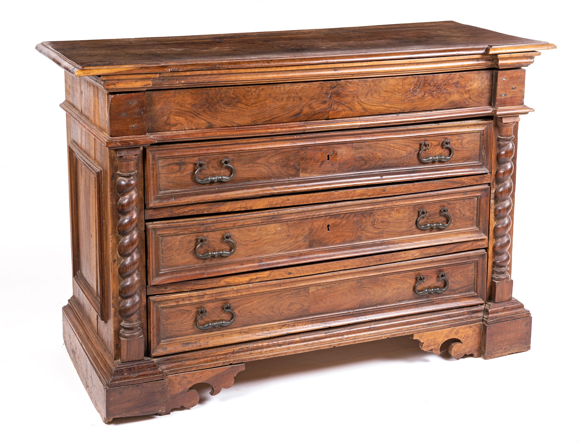 con piano rettangolare sporgente sorretto da una cornice modanata; facciata delimitata da lesene tortili, scandita da un tiretto compreso nella fascia e tre cassetti sottostanti con maniglie in bronzo, piedi a mensola