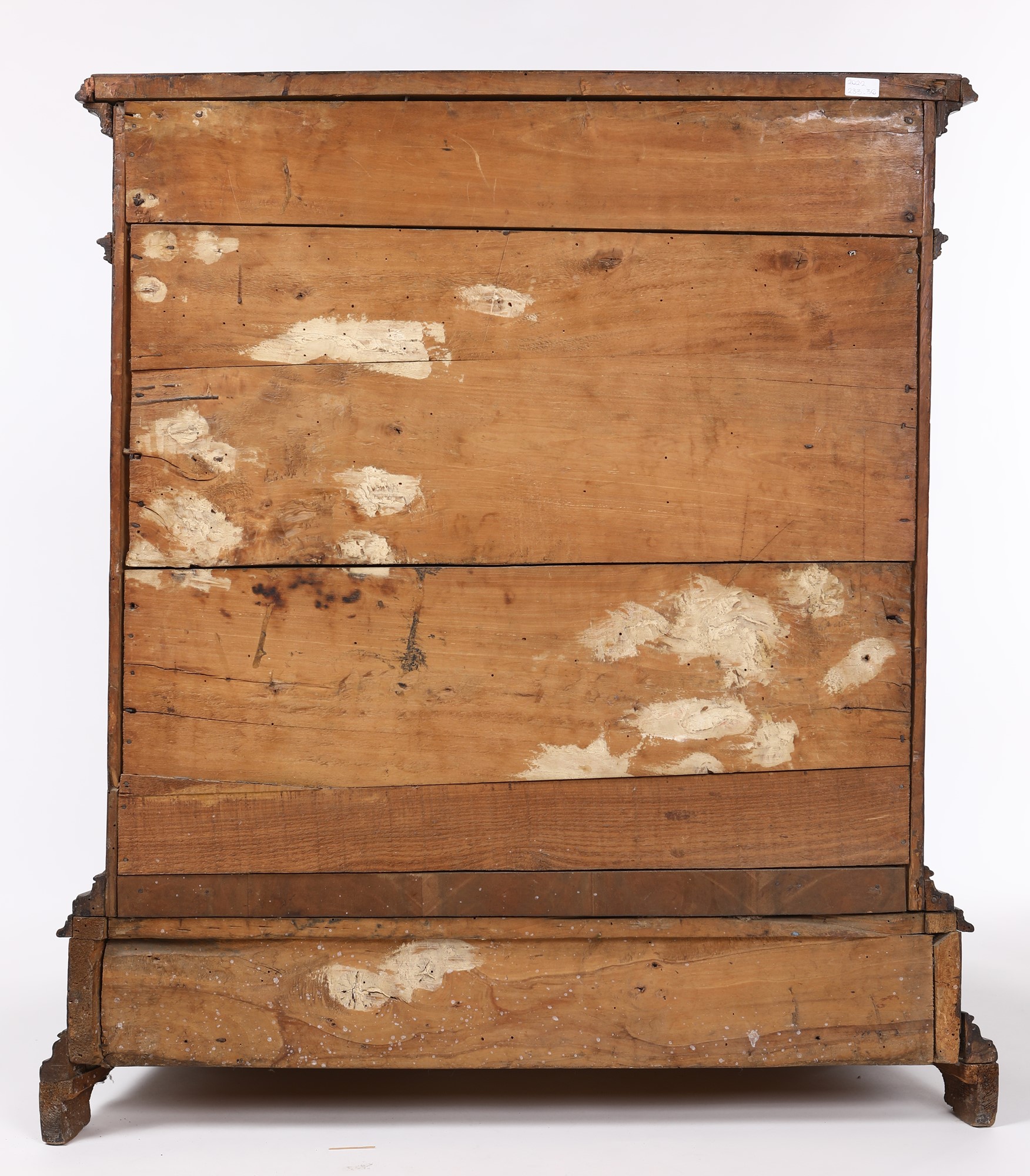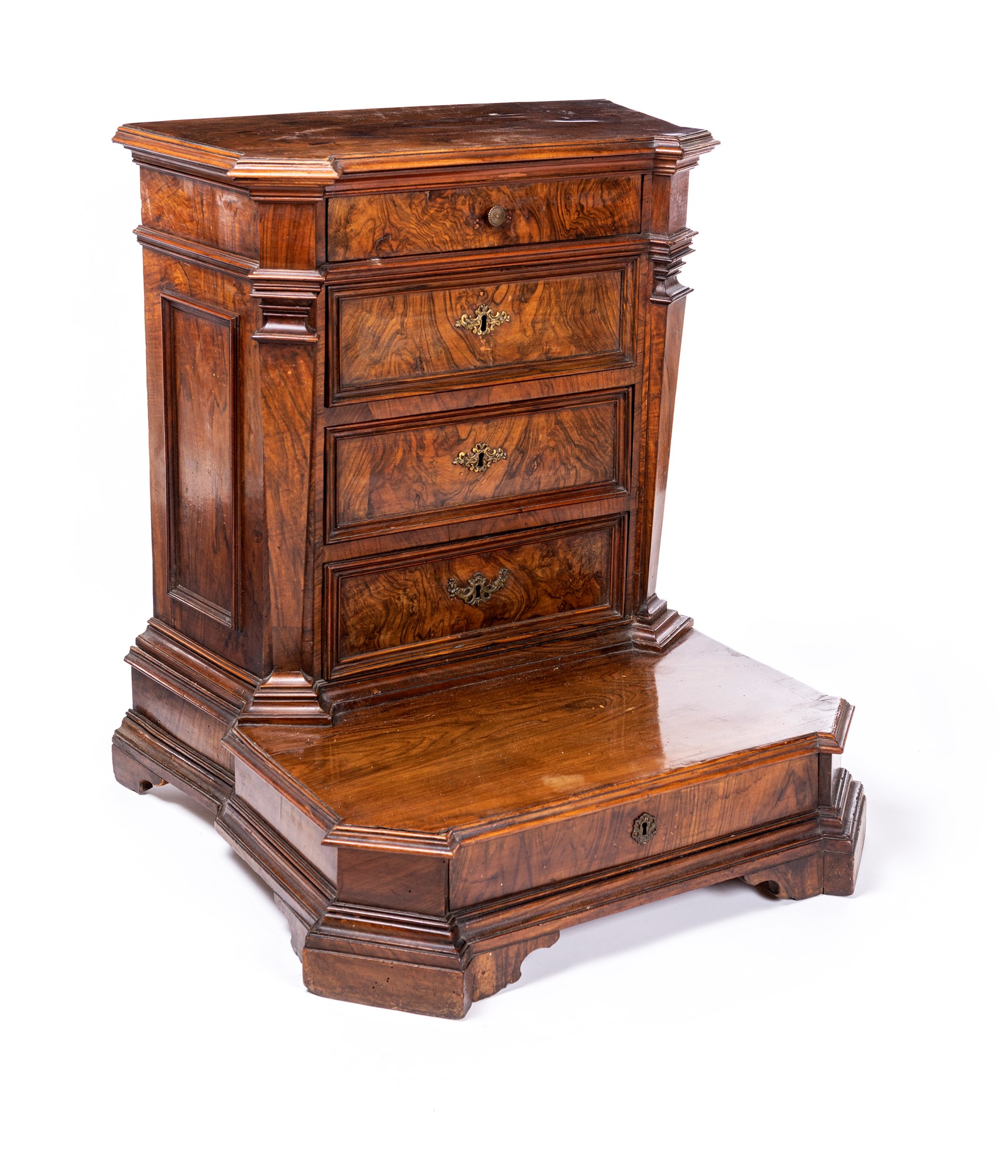 caratterizzato da cinque cassetti frontali di cui uno compreso nella fascia inferiore; spigoli scantonati ornati da lesene angolari, piedi a mensola