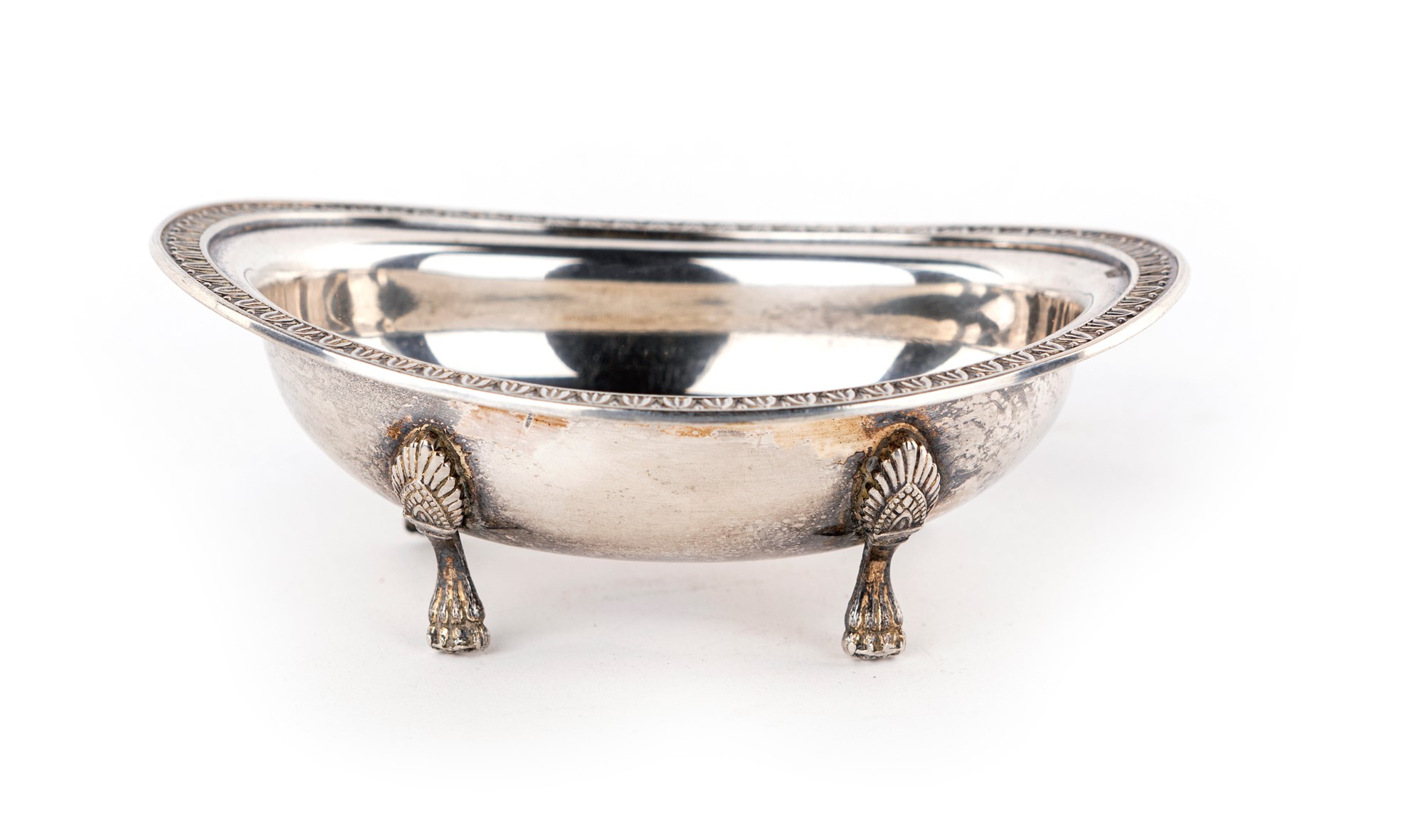 a forma di navicella con profilo cesellato a palmette e quattro piedi ferini