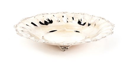 di forma circolare con tesa segnata da baccellature sbalzate ed orlo sagomato percorso da volute contrapposte, piedi cesellati a motivi vegetali