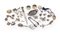 composto da coppia di anelli portatovagliolo, due pinze diverse, un tagliacarte, un piattino ovale, un portapillole, un segna pagina e 17 miniature diverse