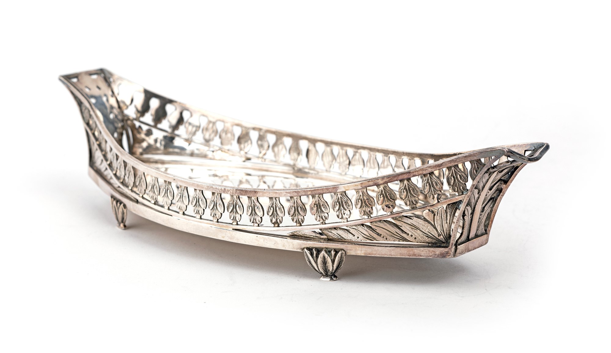 a forma di navicella con ringhiera traforata costituita da foglie in sequenza. Monogramma inciso sotto la base e timbro della collezione Bulgari, Roma