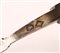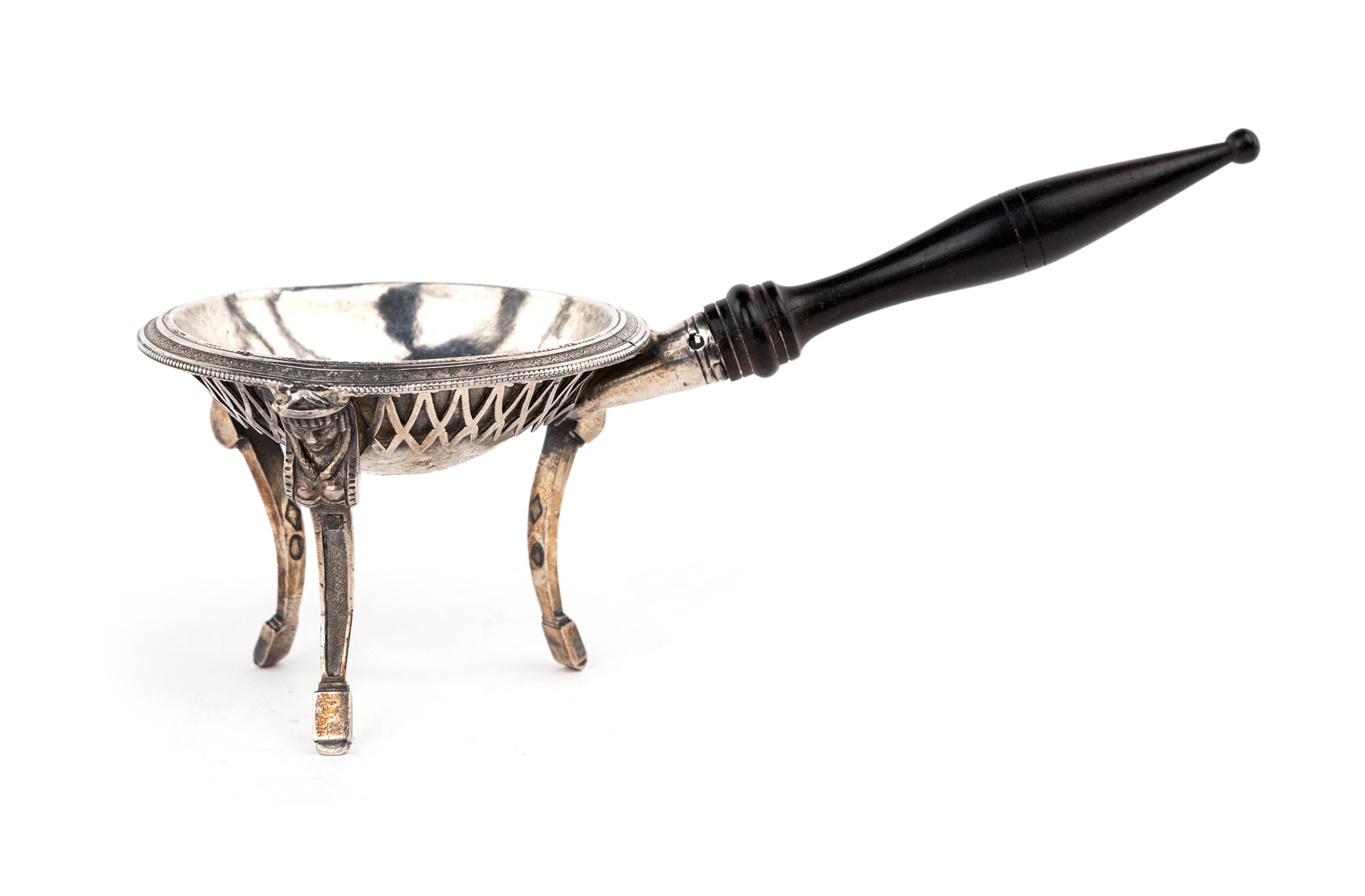 di forma semisferica con orlo minuziosamente inciso, sorretto da tre figure di cariatide riunite da ringhierina di gusto neogotico; manico traverso in legno; piccole ammaccature sparse