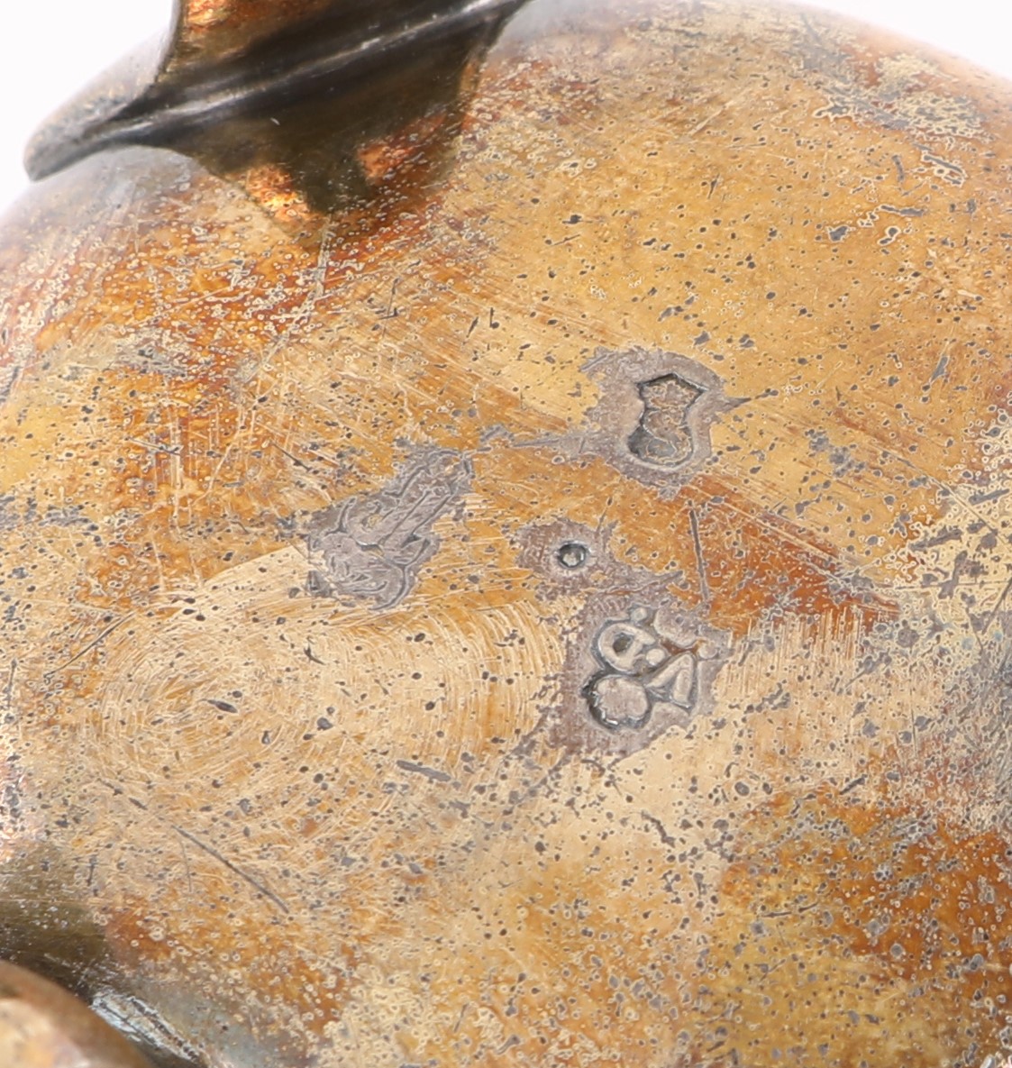 a forma di secchio manico ad anello e tre piedi vegetali; tracce di doratura sull'intera superficie e stemma marchionale inciso