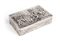 di forma rettangolare con decorazione sbalzata; coperchio incernierato raffigurante San Giorgio, fascia con piccole composizioni di frutta alternate a paesaggi con architetture