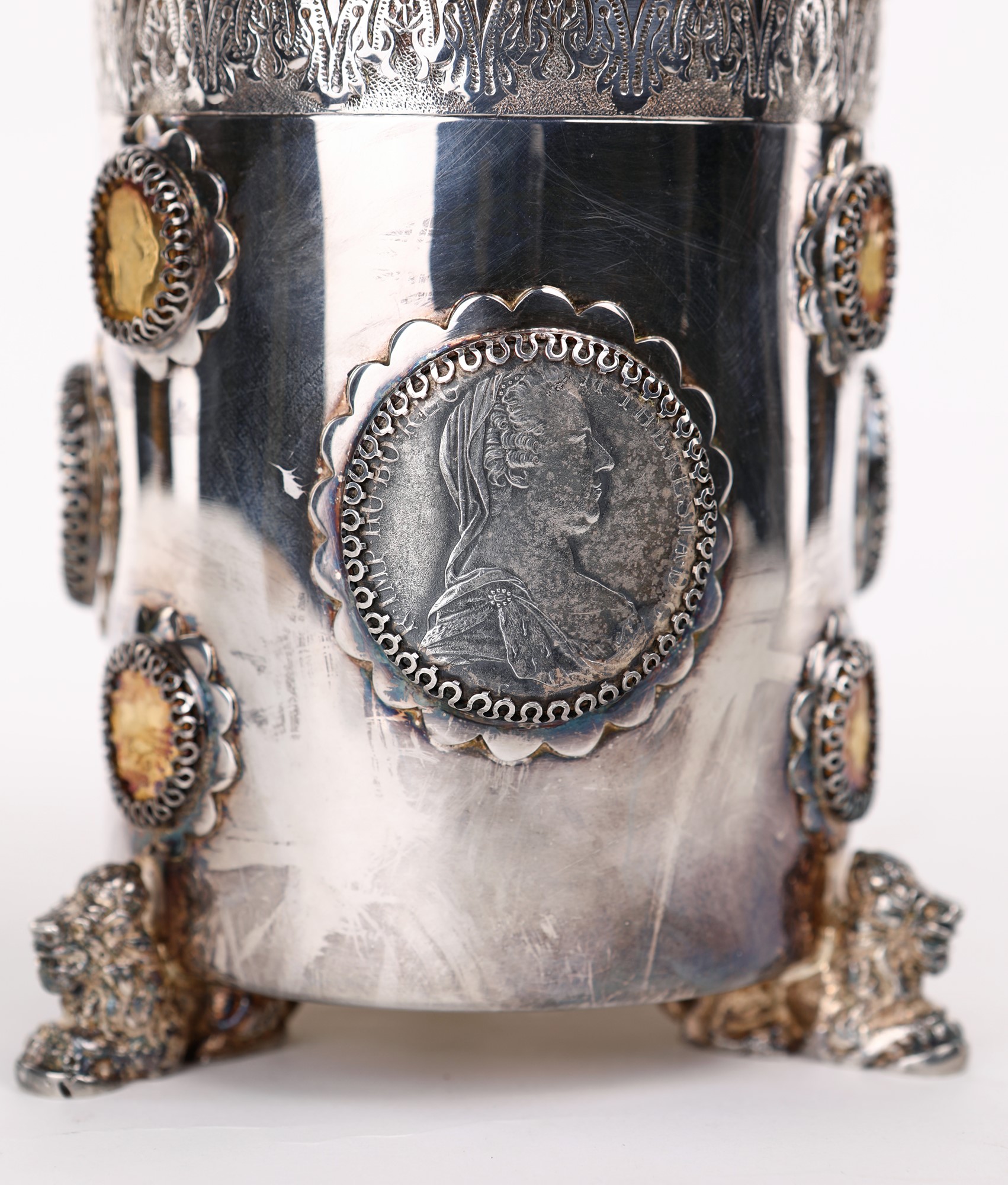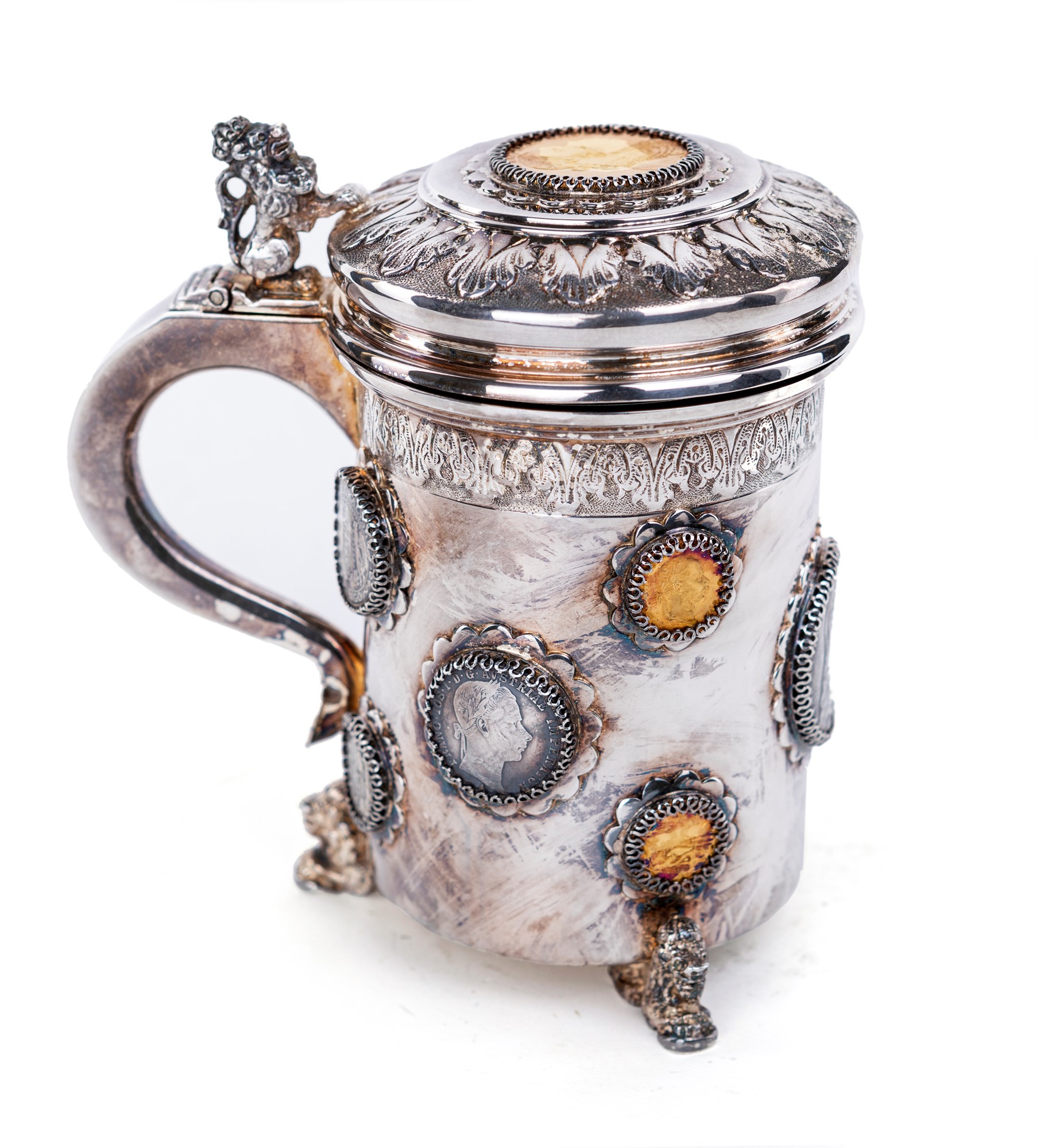 caratterizzato da dodici monete trattenute da una corona di griffes a vista, coniate durante il regno di Francesco Giuseppe Imperatore d'Austria e re di Boemia ed Ungheria, di cui cinque in oro; al centro del coperchio una moneta da quattro fiorini datata 1915 e quattro monete da un fiorino sparse. Sorretto da tre figure scultoree di leone, elemento decorativo ripreso sulla sommità del manico come ausilio per l'apertura del boccale