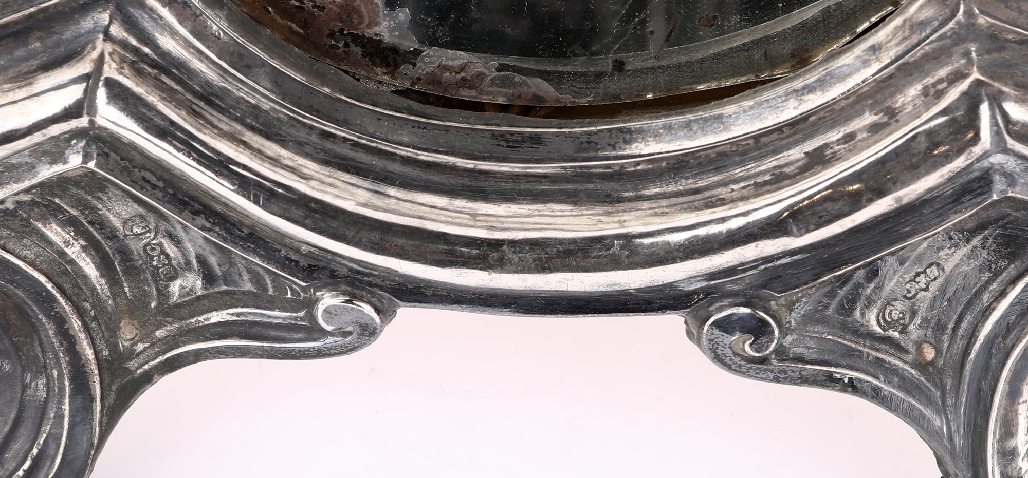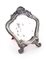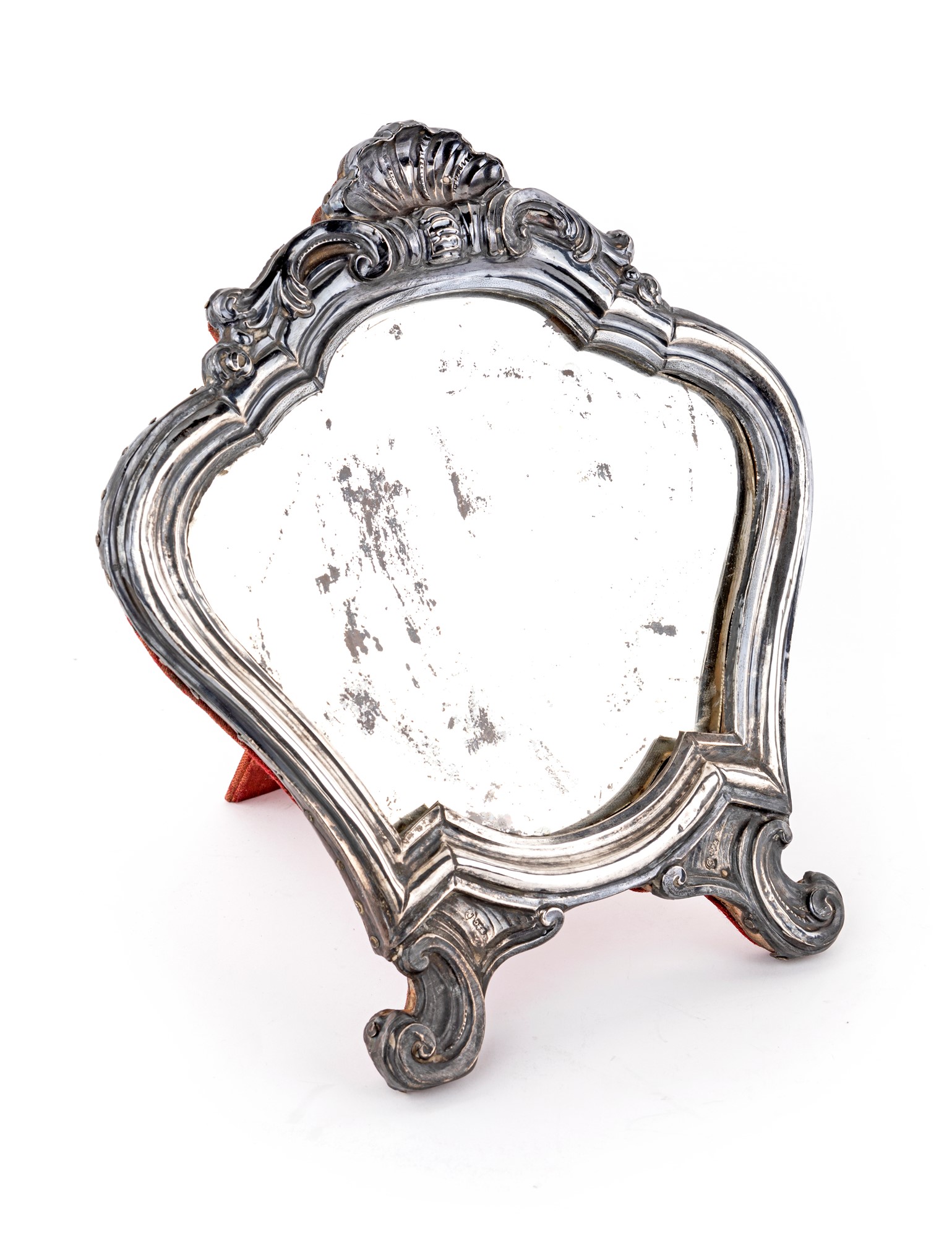 con specchio racchiuso da cornice sagomata su piedi a ricciolo e valva sulla sommità