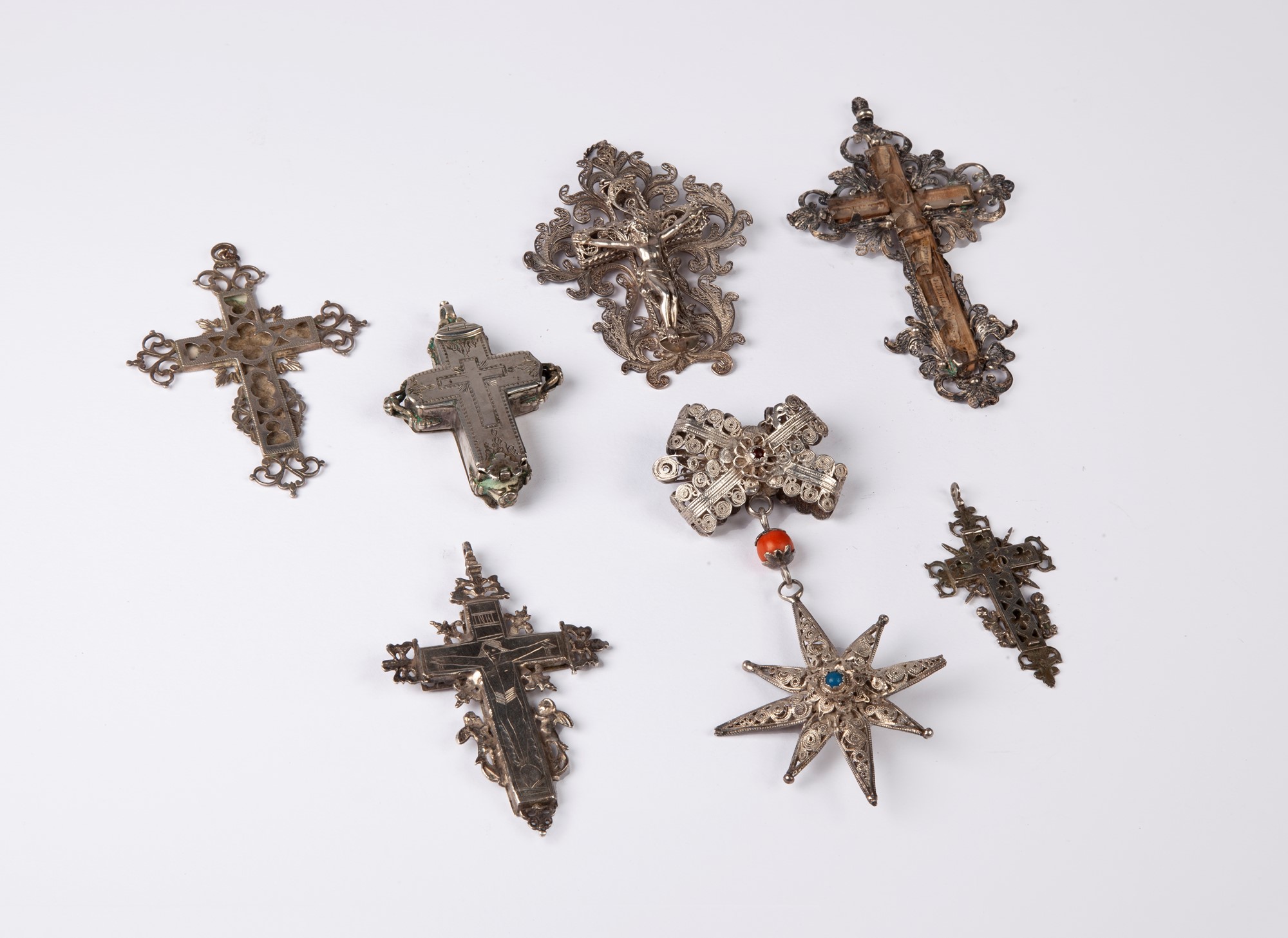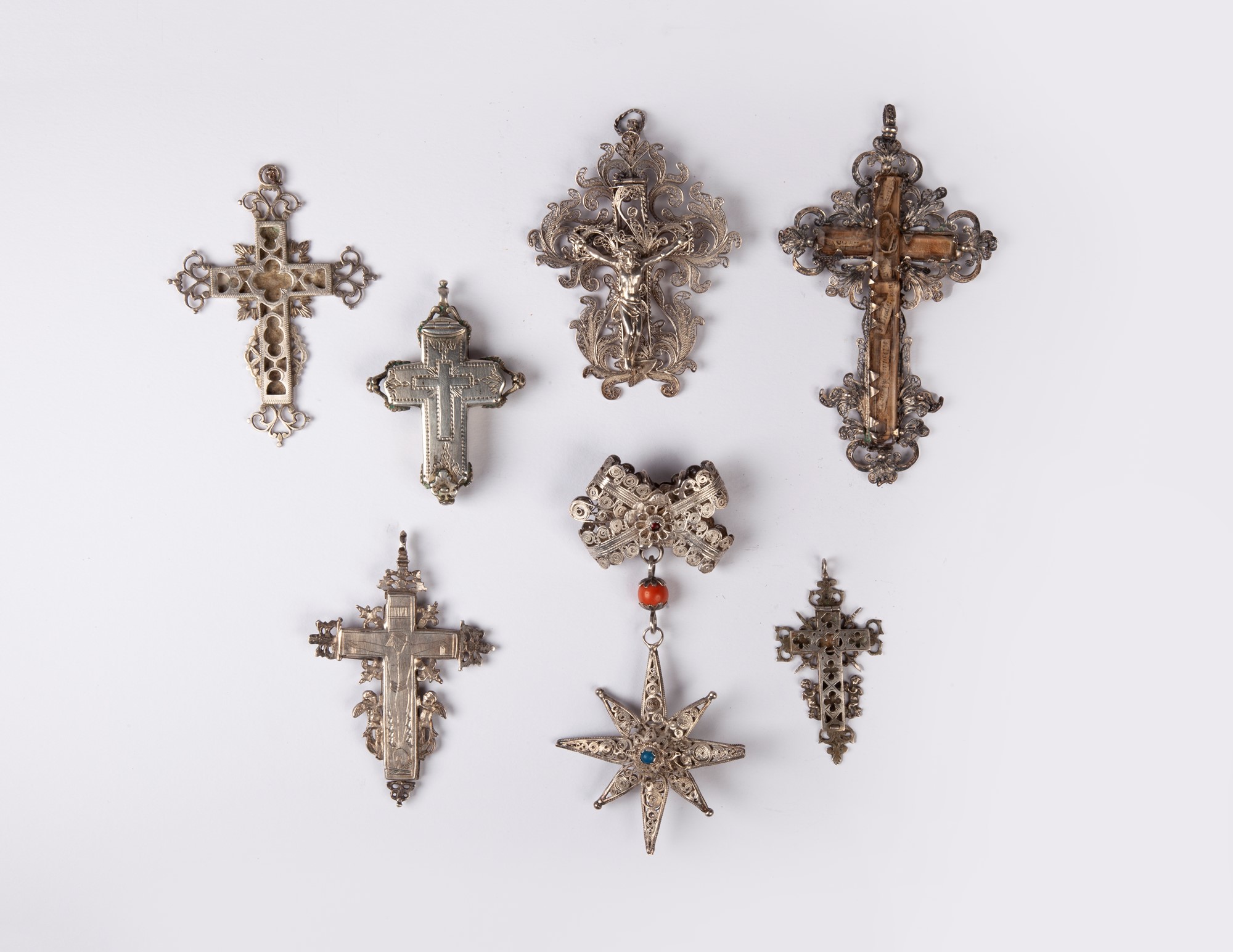 Sei antiche croci reliquiario ed un pendente in filigrana d'argento, XVII, XVIII e XIX secolo