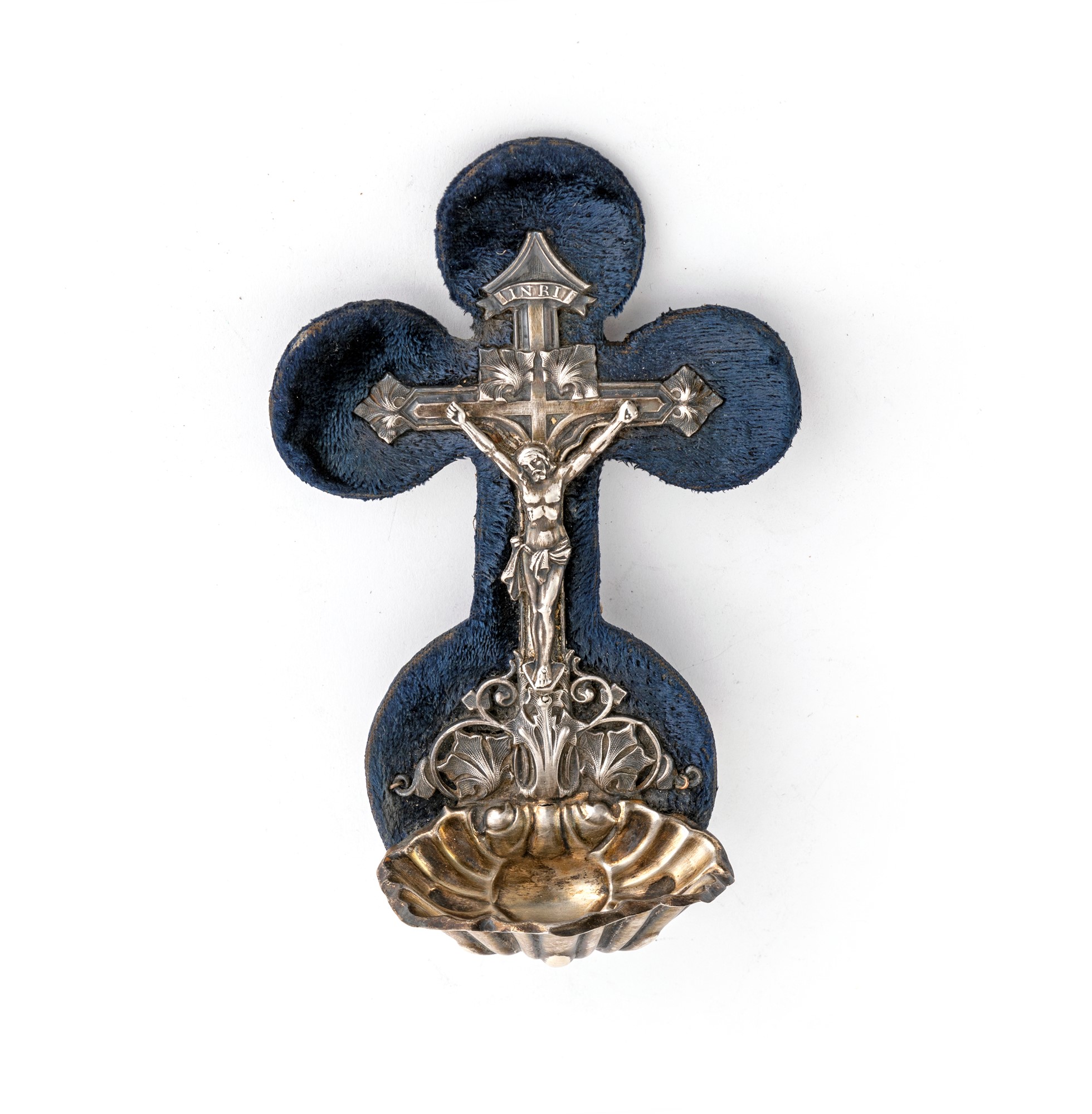 con vaschetta a forma di conchiglia sormontata da crocifisso; supporto in velluto