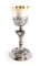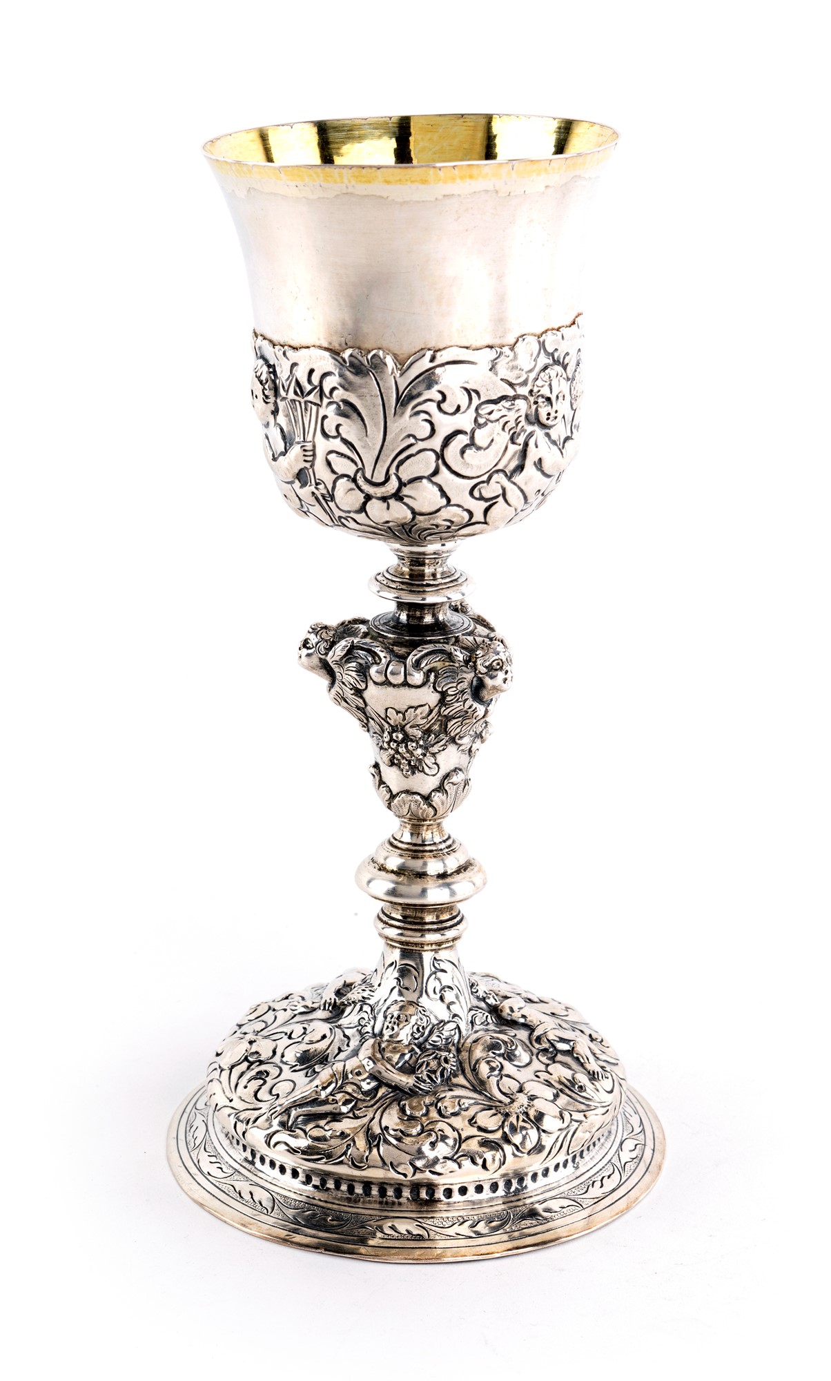 con fitta decorazione sbalzata e cesellata in forma di volute, motivi vegetali, fiori e teste di cherubino; interno dorato, fusto a balaustro su piede circolare