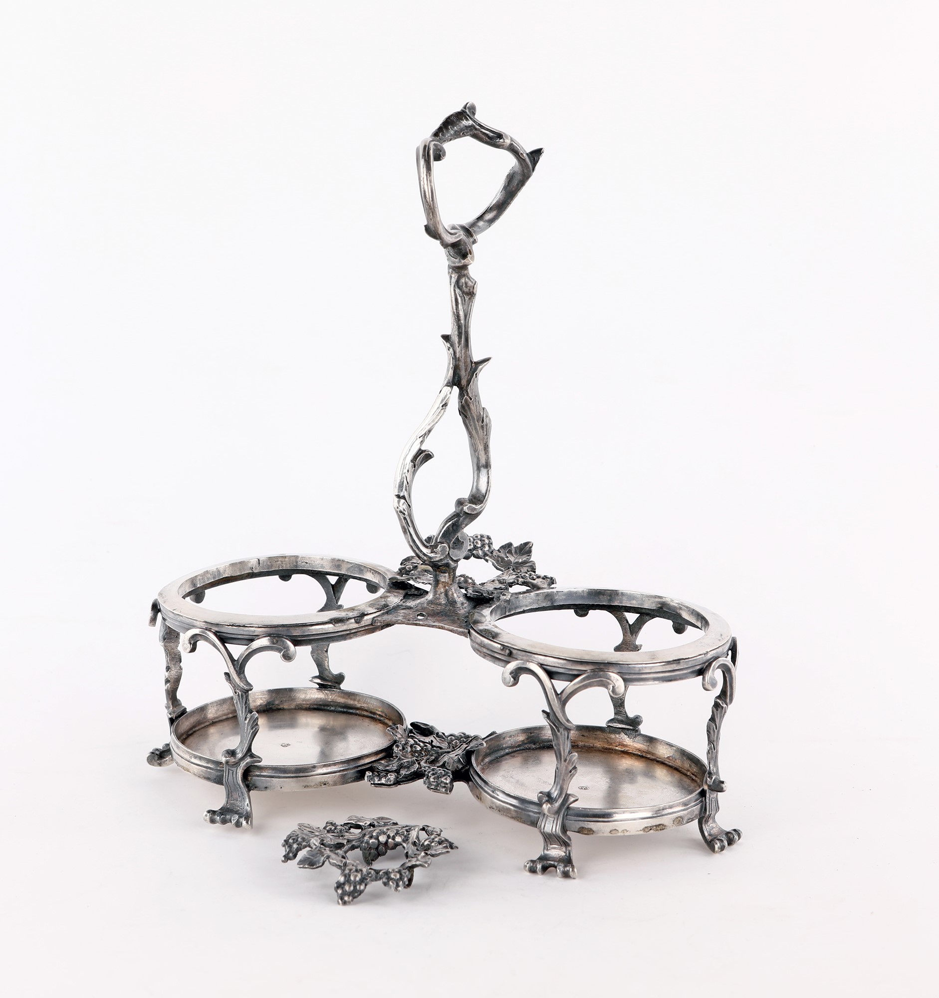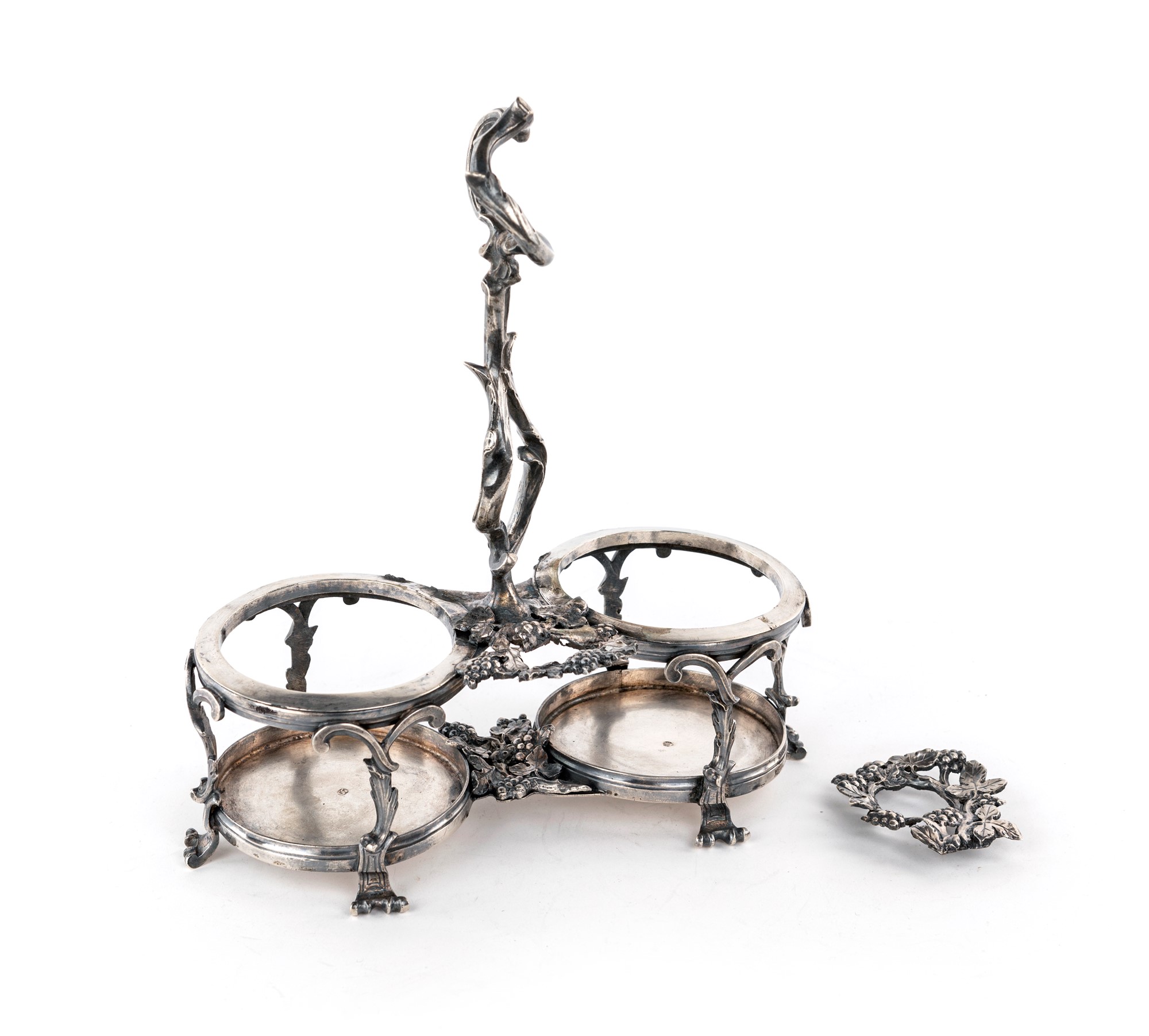 con presa centrale in forma di rami intrecciati e porta tappi a guisa di ghirlanda di vite; ampolle mancanti e difetti