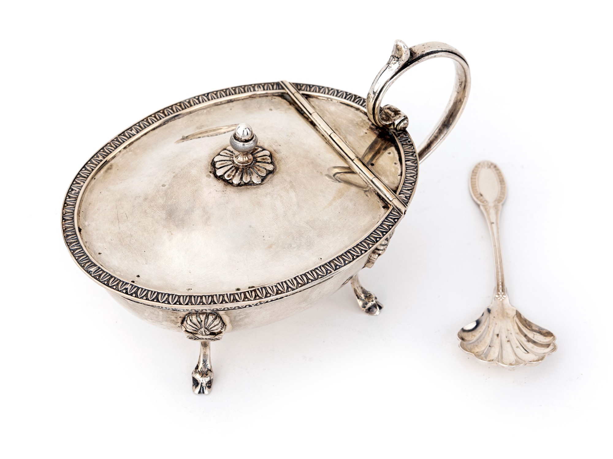 di forma ovale con profili a palmette, coperchio incernierato sormontato da una ghianda, manico a ricciolo e piedi caprini; vaschetta interna in vetro e cucchiaio con paletta a forma di conchiglia