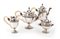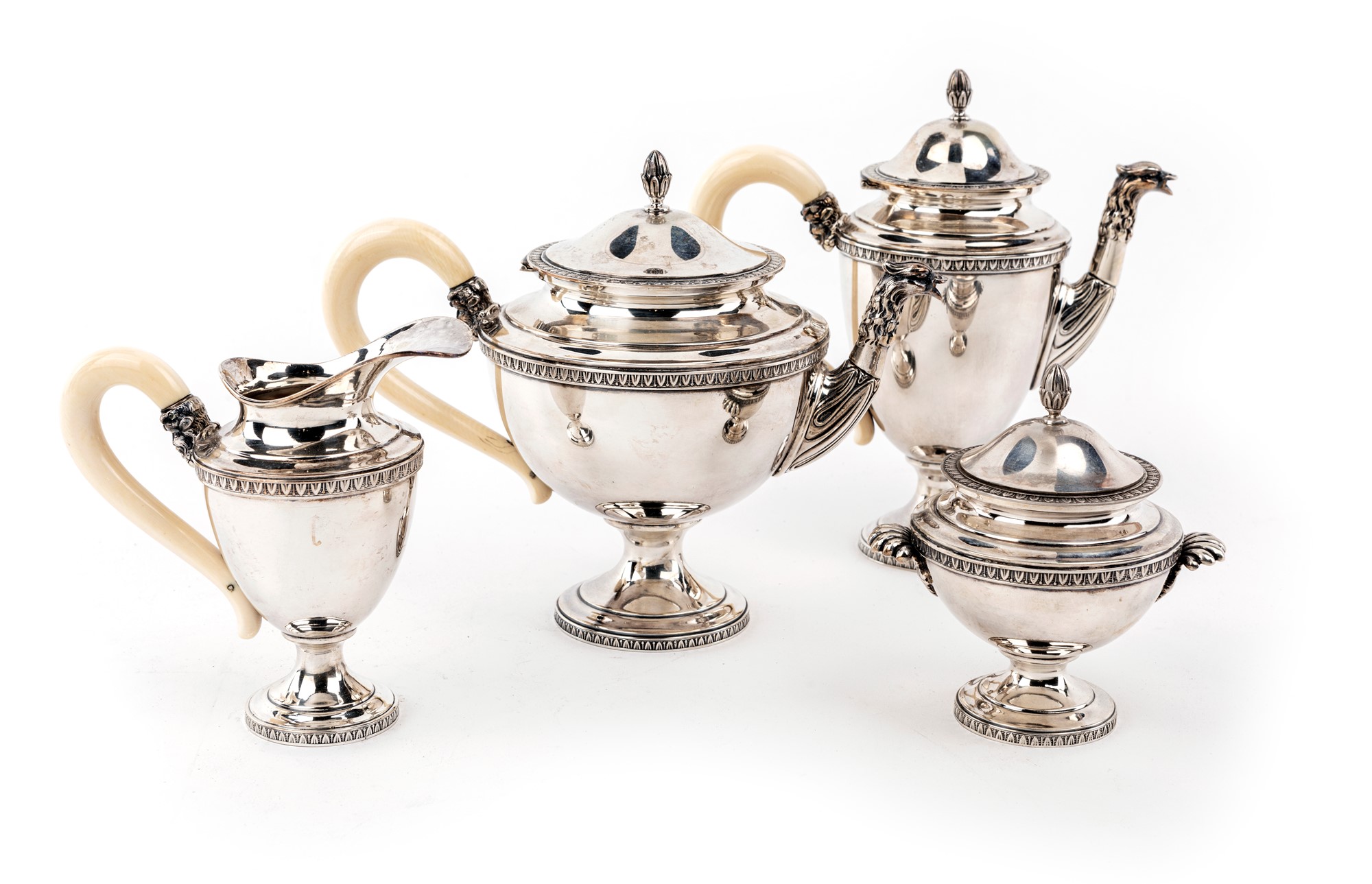 con corpi lisci su piede circolare, scanditi da profili cesellati a palmette; coperchi a cupolino sormontati da ghianda, la caffettiera e la teiera con versatoio sagomato e beccuccio zoomorfo; manici sagomati con attacchi a mascherone