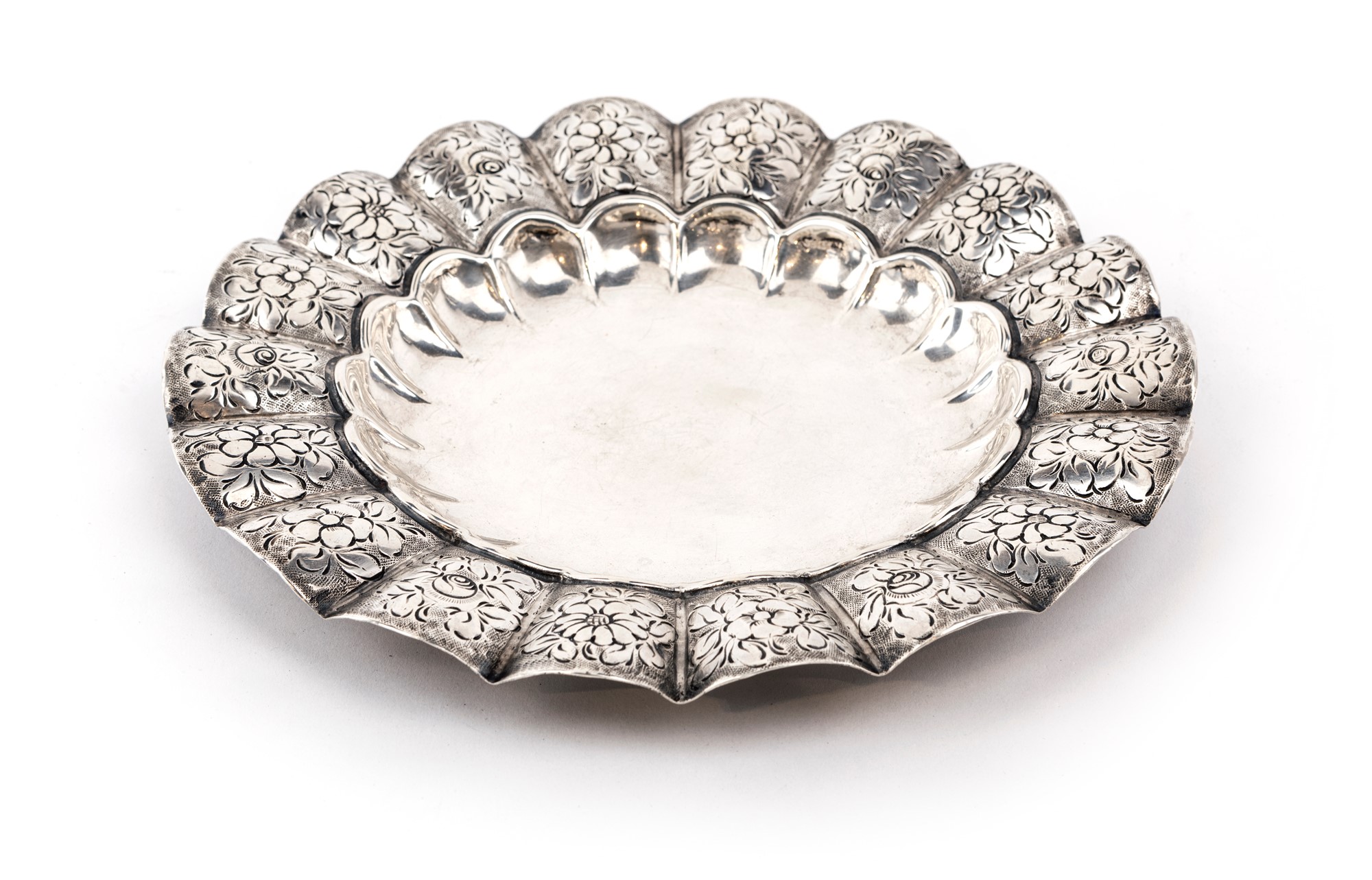 di forma circolare con cavetto centinato e ampia tesa ondulata decorata da fiori incisi e cesellati