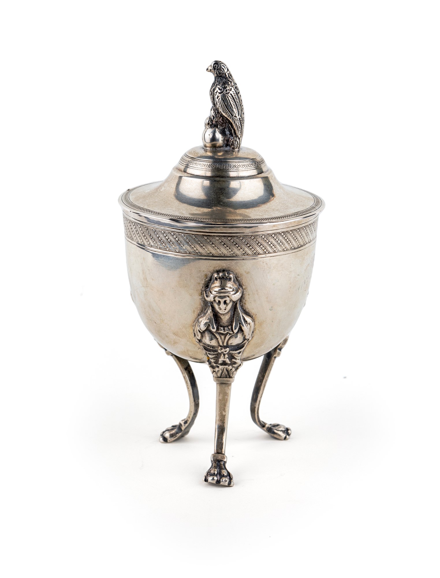 con corpo a uovo ornato da una fascia incisa minuziosamente, sorretto da tre figure di cariatide con estremità a zampa ferina; coperchio a cupolino sormontato da presa scultorea in forma di pappagallo