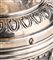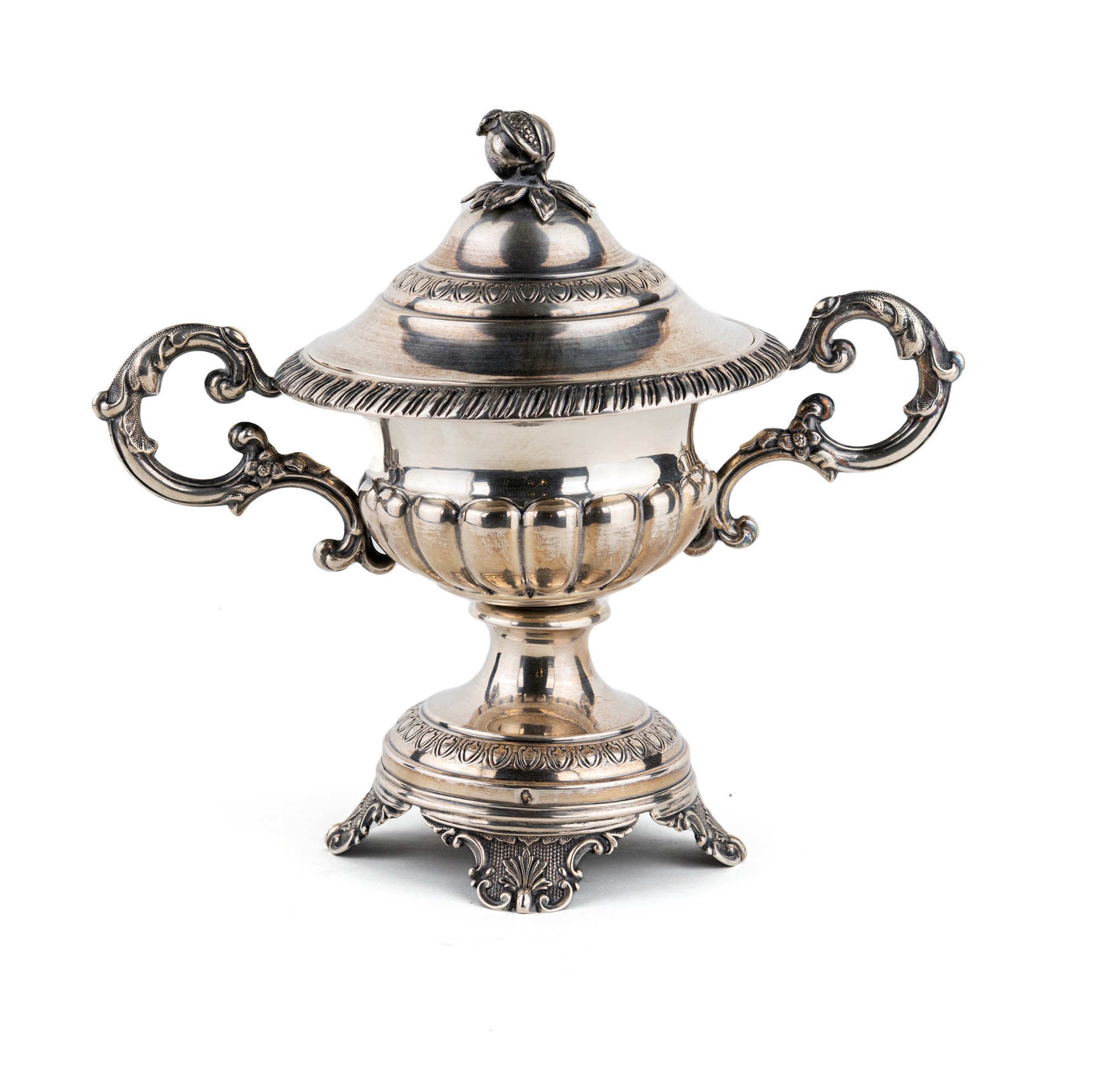 a forma di coppa baccellata su piede circolare poggiante su quattro cartigli sbalzati e cesellati, manici sagomati caratterizzati da rilievi vegetali e piccole corolle, coperchio a cupolino sormontato da melagrana. Bollo testa di Minerva