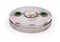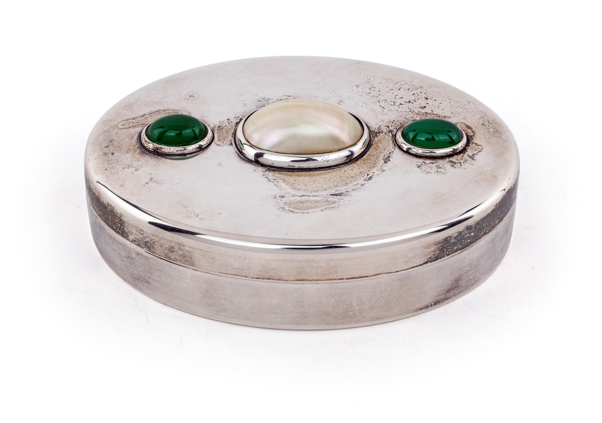 di forma ovale con coperchio decorato da una madreperla affiancata da due cabochon in pietra dura verde
